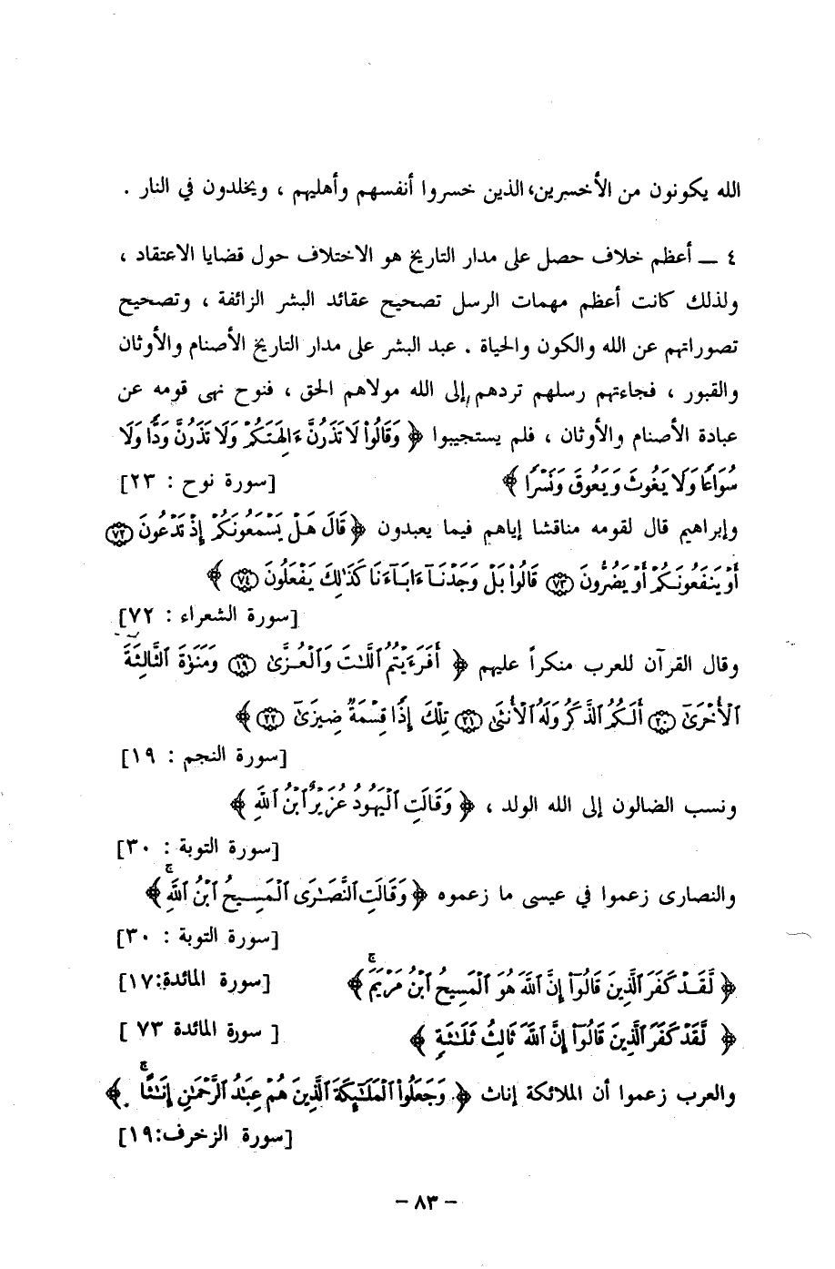 4 - أعظم خلاف حصل على مدار التاريخ هو الاختلاف حول قضايا الاعتقاد، ولذلك كانت أعظم مهمات الرسل تصحيح عقائد البشر الزائفة، وتصحيح تصوراتهم عن الله والكون والحياة. عبد البشر على مدار التاريخ الأصنام والأوثان والقبور، فجاءتهم رسلهم تردهم إلى الله مولاهم الحق، فنوح نهى قومه عن عبادة الأصنام والأوثان، فلم يستجيبوا {وَقَالُوا لَا تَذَرُنَّ آلِهَتَكُمْ وَلَا تَذَرُنَّ وَدًّا وَلَا سُوَاعًا وَلَا يَغُوثَ وَيَعُوقَ وَنَسْرًا} [نوح: 23].