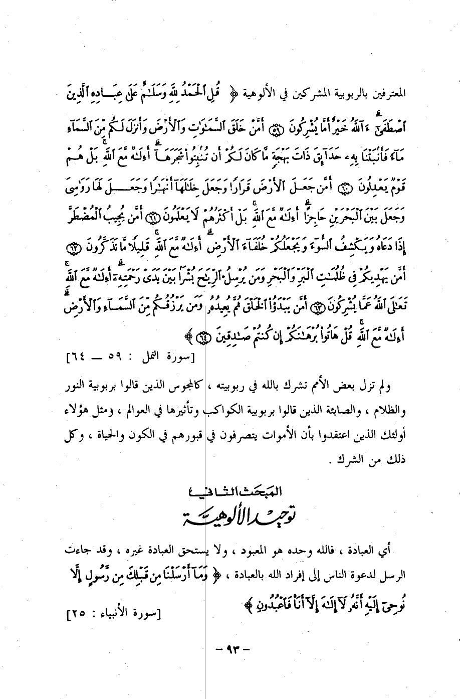 المعترفين بالربوبية المشركين في الألوهية {قُلِ الْحَمْدُ لِلَّهِ وَسَلَامٌ عَلَى عِبَادِهِ الَّذِينَ اصْطَفَى آللَّهُ خَيرٌ أَمَّا يُشْرِكُونَ (59) أَمَّنْ خَلَقَ السَّمَاوَاتِ وَالْأَرْضَ وَأَنْزَلَ لَكُمْ مِنَ السَّمَاءِ مَاءً فَأَنْبَتْنَا بِهِ حَدَائِقَ ذَاتَ بَهْجَةٍ مَا كَانَ لَكُمْ أَنْ تُنْبِتُوا شَجَرَهَا أَإِلَهٌ مَعَ اللَّهِ بَلْ هُمْ قَوْمٌ يَعْدِلُونَ (60) أَمَّنْ جَعَلَ الْأَرْضَ قَرَارًا وَجَعَلَ خِلَالهَا أَنْهَارًا وَجَعَلَ لَهَا رَوَاسِيَ وَجَعَلَ بَينَ الْبَحْرَينِ حَاجِزًا أَإِلَهٌ مَعَ اللَّهِ بَلْ أَكْثَرُهُمْ لَا يَعْلَمُونَ (61) أَمَّنْ يُجِيبُ الْمُضْطَرَّ إِذَا دَعَاهُ وَيَكْشِفُ السُّوءَ وَيَجْعَلُكُمْ خُلَفَاءَ الْأَرْضِ أَإِلَهٌ مَعَ اللَّهِ قَلِيلًا مَا تَذَكَّرُونَ (62) أَمَّنْ يَهْدِيكُمْ فِي ظُلُمَاتِ الْبَرِّ وَالْبَحْرِ وَمَنْ يُرْسِلُ الرِّيَاحَ بُشْرًا بَينَ يَدَي رَحْمَتِهِ أَإِلَهٌ مَعَ اللَّهِ تَعَالى اللَّهُ عَمَّا يُشْرِكُونَ (63) أَمَّنْ يَبْدَأُ الْخَلْقَ ثُمَّ يُعِيدُهُ وَمَنْ يَرْزُقُكُمْ مِنَ السَّمَاءِ وَالْأَرْضِ أَإِلَهٌ مَعَ اللَّهِ قُلْ هَاتُوا بُرْهَانَكُمْ إِنْ كُنْتُمْ صَادِقِينَ (64)} [النمل: 59 - 64].