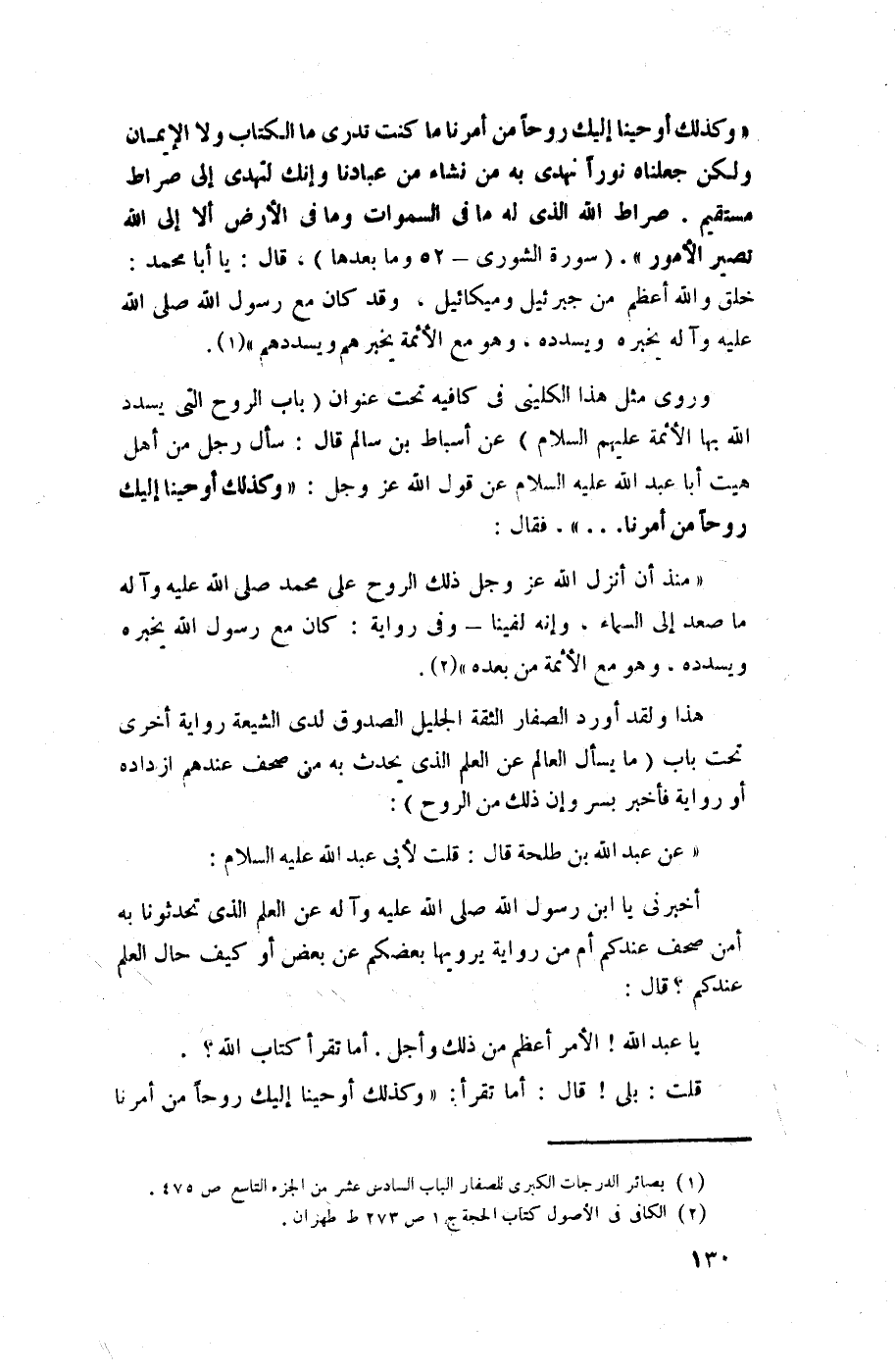وروى مثل هذا الكليني في كافيه تحت عنوان (باب الروح التي يسدد الله بها الأئمة عليهم السلام) عن أسباط بن سالم قال: سأل رجل من أهل هيت أبا عبد الله عليه السلام عن قول الله عز وجل: {وكذلك أوحينا إليك روحاً من أمرنا .. } فقال: