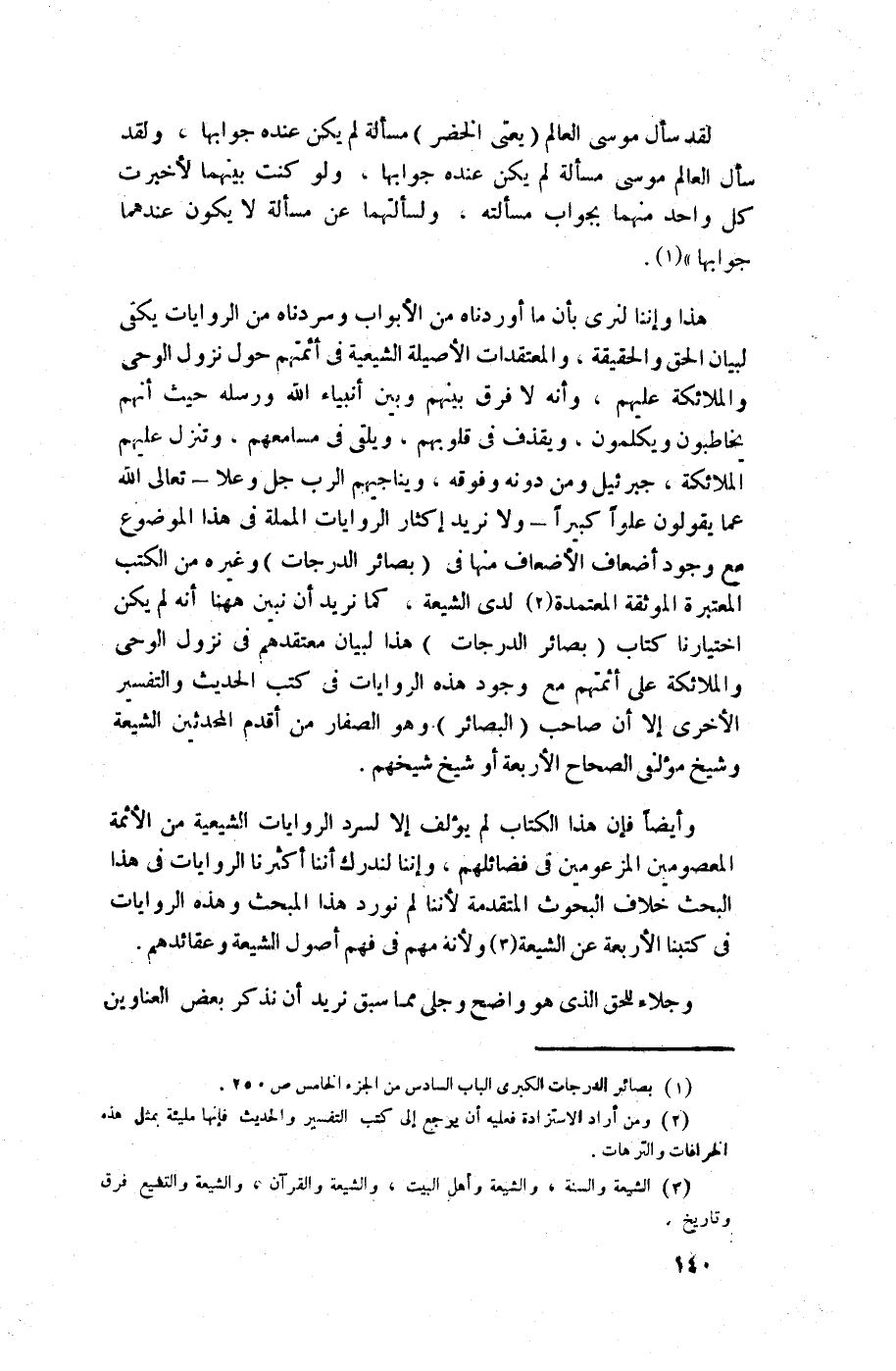 هذا وإننا لنرى بأن ما أوردناه من الأبواب وسردناه من الروايات يكفي لبيان الحق والحقيقة، والمعتقدات الأصيلة الشيعية في أئمتهم حول نزول الوحي والملائكة عليهم، وأنه لا فرق بينهم وبين أنبياء الله ورسله حيث أنهم يخاطبون ويكلمون، ويقذف في قلوبهم، ويلقى في مسامعهم، وتنزل عليهم الملائكة، جبرئيل ومن دونه وفوقه، ويناجيهم الرب جل وعلا - تعالى الله عما يقولون علواً كبيراً - ولا نريد إكثار الروايات المملة في هذا الموضوع مع وجود أضعاف الأضعاف منها في (بصائر الدرجات) وغيره من الكتب المعتبرة الموثقة المعتمدة (¬2) لدى الشيعة، كما نريد أن نبين ههنا أنه لم يكن اختيارنا كتاب (بصائر الدرجات) هذا لبيان معتقدهم في نزول الوحي والملائكة على أئمتهم مع وجود هذه الروايات في كتب الحديث والتفسير الأخرى إلا أن صاحب (البصائر) وهو الصفار من أقدم المحدثين الشيعة وشيخ مؤلفي الصحاح الأربعة أو شيخ شيخهم.