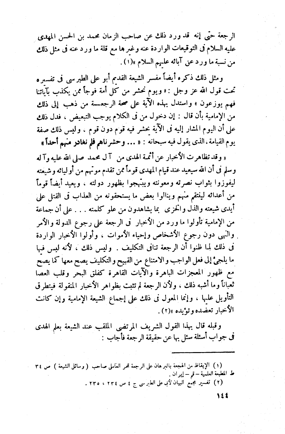"وقد تظاهرت الأخبار عن أئمة الهدى من آل محمد - صلى الله عليه وسلم - في أن الله سيعيد عند قيا المهدي قوماً ممن تقدم موتهم من أوليائه وشيعته ليفوزوا بثواب نصرته ومعونته ويبتهجوا بظهور دولته، ويعيد أيضاً قوماً من أعدائه لينتقم منهم وينالوا بعض ما يستحقونه من العذاب في القتل على أيدي شيعته والذل والخزي بما يشاهدون من علو كلمته .. على أن جماعة من الإمامية تأولوا ما ورد من الأخبار في الرجعة على رجوع الدولة والأمر والنهي دون رجوع الأشخاص وإحياء الأموات، وأولوا الأخبار الواردة في ذلك لما ظنوا أن الرجعة تنافي التكليف. وليس ذلك، لأنه ليس فيها ما يلجئ إلى فعل الواجب والامتناع من القبيح والتكليف يصح معها كما يصح مع ظهور المعجزات الباهرة والآيات القاهرة كفلق البحر وقلب العصا تعباناً وما أشبه ذلك، ولأن الرجعة لم تثبت بظواهر الأخبار المنقولة فيتطرق التأويل عليها، وإنما المعول في ذلك على إجماع الشيعة الإمامية وإن كانت الأخبار تعضده وتؤيده" (¬2).