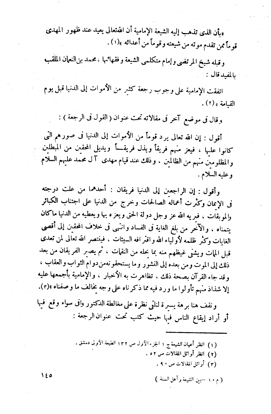 وأقول: إن الراجعين إلى الدنيا فريقان: أحدهما من علت درجته في الإيمان وكثرت أعماله الصالحات وخرج من الدنيا على اجتناب الكبائر والموبقات، فيريه الله عز وجل دولة الحق ويعزه بها ويعطيه من الدنيا ما كان يتمناه، والآخر من بلغ الغاية في الفساد وانتهى في خلاف المحقين إلى أقصى الغايات وكثر ظلمه لأولياء الله واقترافه السيئات، فينتصر الله تعالى لمن تعدى قبل الممات ويشفي غيظهم منه بما يحله من النقمات، ثم يصير الفريقان من بعد ذلك إلى الموت ومن بعده إلى النشور وما يستحقونه من دوام الثواب والعقاب، وقد جاء القرآن بصحة ذلك، تظاهرت به الأخبار، والإمامية بأجمعها عليه إلا شذاذ منهم تأولوا ما ورد فيه مما ذكرناه على وجه يخالف ما وصفناه" (¬3).