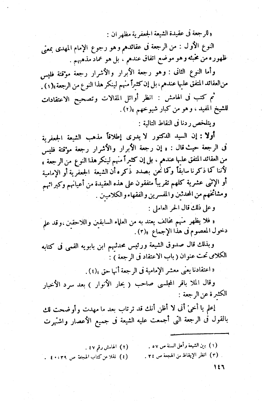 أولاً: إن السيد الدكتور لا يدري إطلاقاً مذهب الشيعة الجعفرية في الرجعة حيث قال: "إن رجعة الأبرار والأشرار رجعة مؤقتة فليس من العقائد المتفق عليها عندهم. بل إن كثيراً منهم لينكر هذا النوع من الرجعة" لأننا كما ذكرنا سابقاً وكما نحن بصدد ذكره أن الشيعة الجعفرية أو الإمامية أو الاثنى عشرية كلهم تقريباً متفقون على هذه العقيدة من أعيانهم وكبرائهم ومشائخهم من المحدثين والمفسرين والفقهاء والكلاميين.