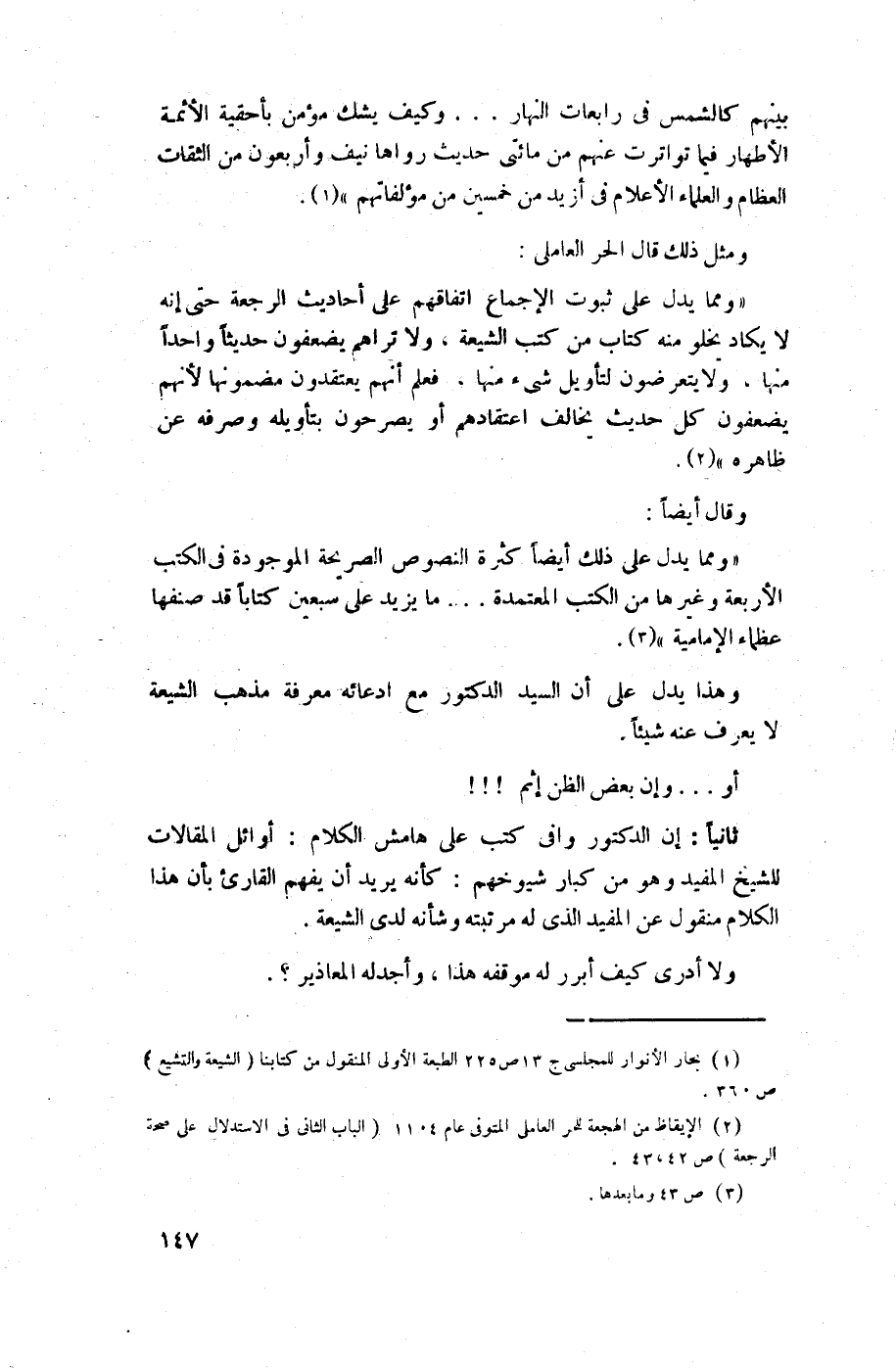 ثانياً: إن الدكتور وافي كتب على هامش الكلام: أوائل المقالات للشيخ المفيد وهو من كبار شيوخهم: كأنه يريد أن يفهم القارئ بأن هذا الكلام منقول عن المفيد الذي له مرتبته وشأنه لدى الشيعة.