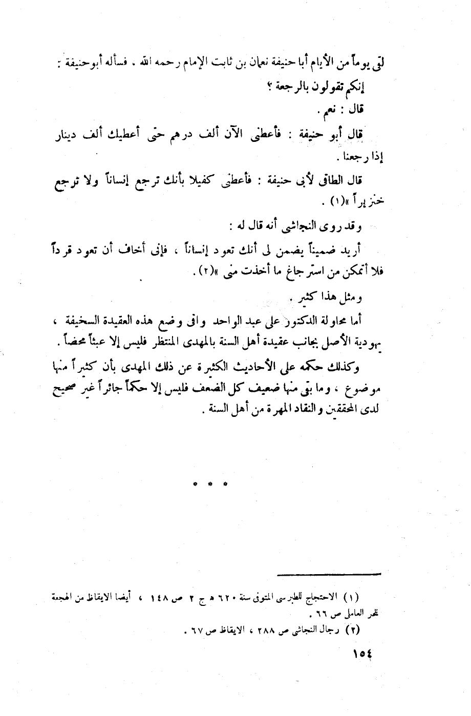 لقي يوماً من الأيام أبا حنيفة نعمان بن ثابت الإمام رحمه الله، فسأله أبو حنيفة: إنكم تقولون بالرجعة؟