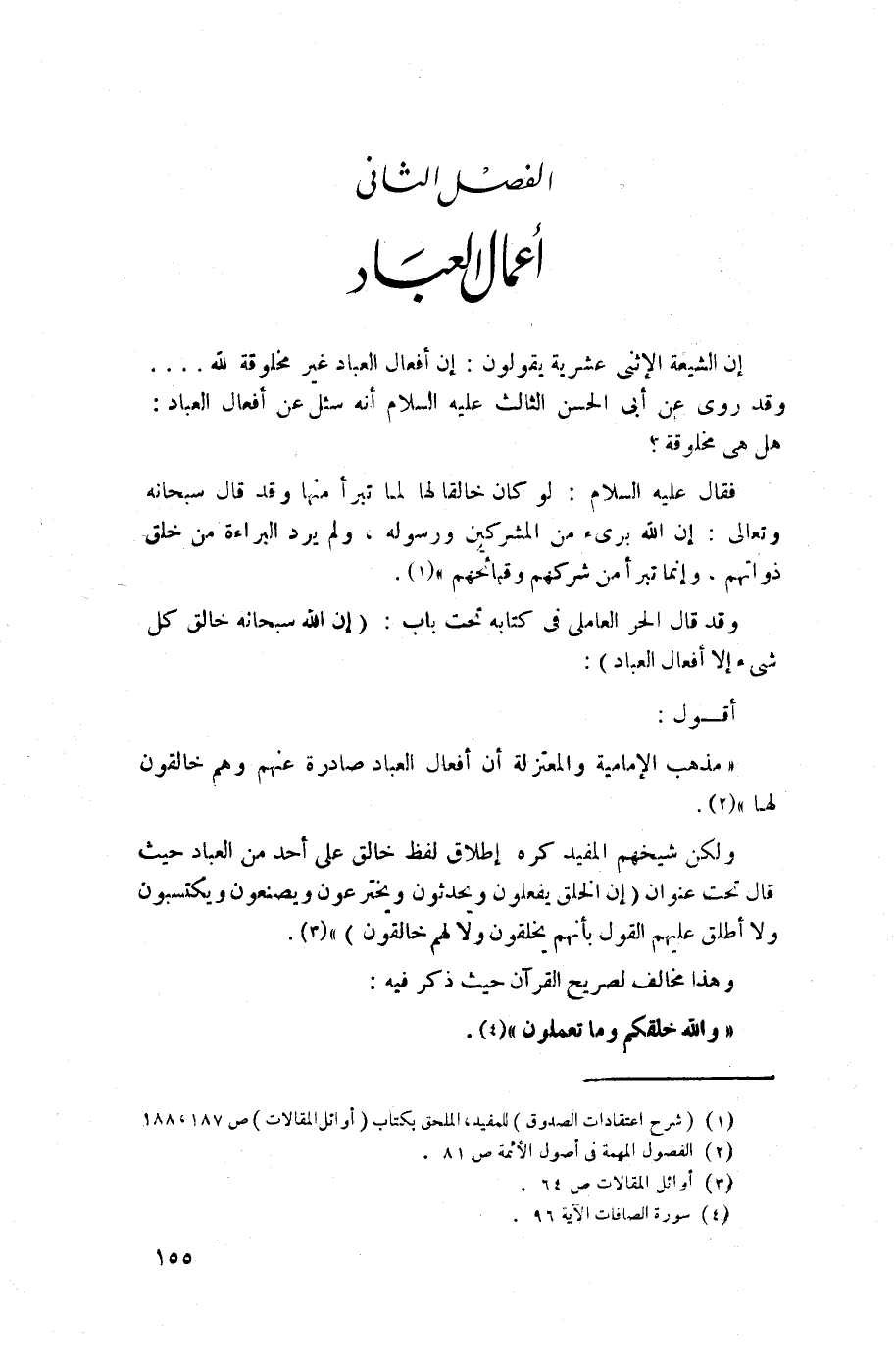 "مذهب الإمامية والمعتزلة أن أفعال العباد صادرة عنهم وهم خالقون لها" (¬2).