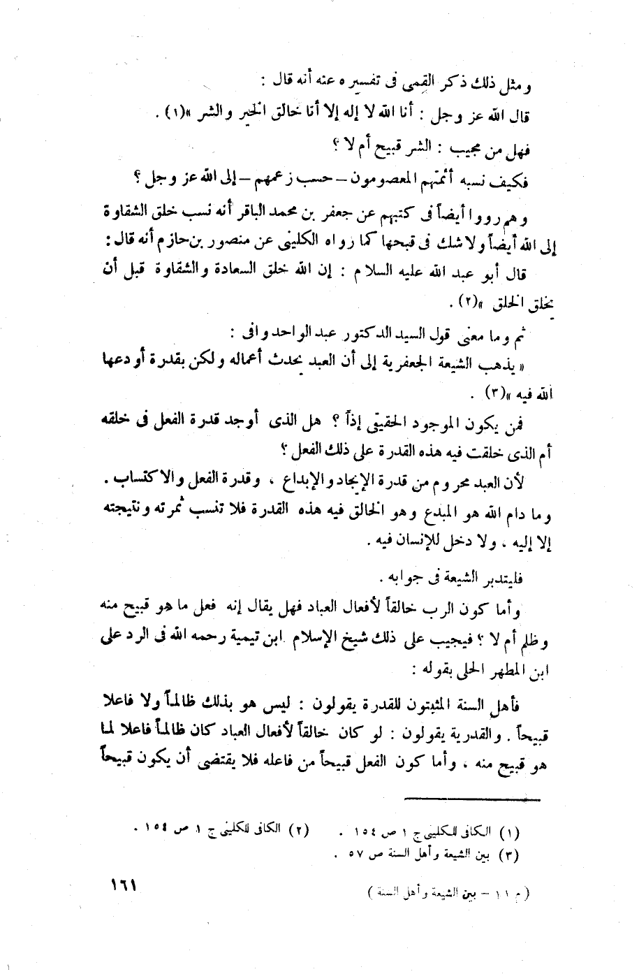 "يذهب الشيعة الجعفرية إلى أن العبد يحدث أعماله ولكن بقدرة أودعها الله فيه" (¬3).