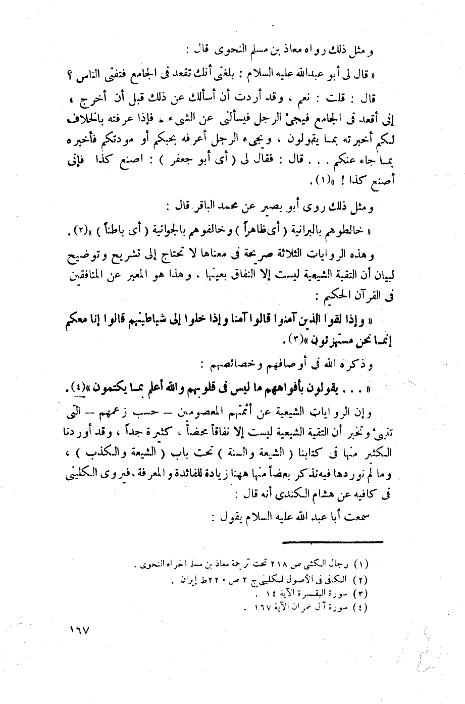 وهذه الروايات الثلاثة صريحة في معناها لا تحتاج إلى تشريح وتوضيح لبيان أن التقية الشيعية ليست إلا النفاق بعينها، وهذا هو المعبر عن المنافقين في القرآن الحكيم: