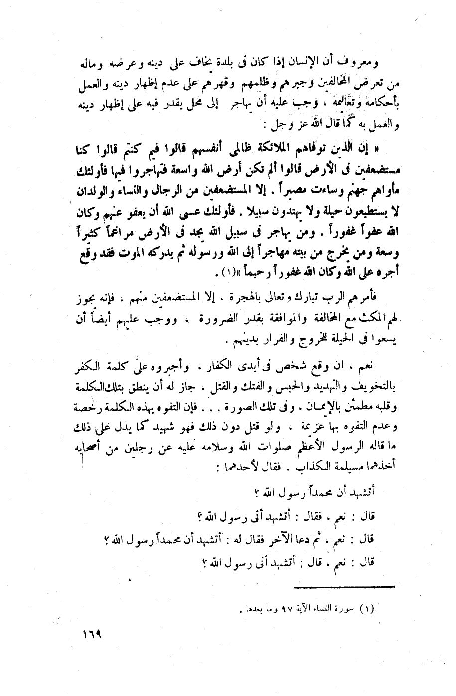 {إن الذين توفاهم الملائكة ظالمي أنفسهم قالوا فيم كنتم قالوا كنا مستضعفين في الأرض قالوا ألم تكن أرض الله واسعة فتهاجروا فيها فأولئك مأواهم جهنم وساءت مصيراً * إلا المستضعفين من الرجال والنساء والولدان لا يستطيعون حيلة ولا يهتدون سبيلاً * فأولئك عسى الله أن يعفو عنهم وكان الله عفواً غفوراً * ومن يهاجر في سبيل الله يجد في الأرض مراغماً كثيراً وسعة ومن يخرج من بيته مهاجراً إلى الله ورسوله ثم يدركه الموت فقد وقع أجره على الله وكان الله غفوراً رحيماً} (¬1).