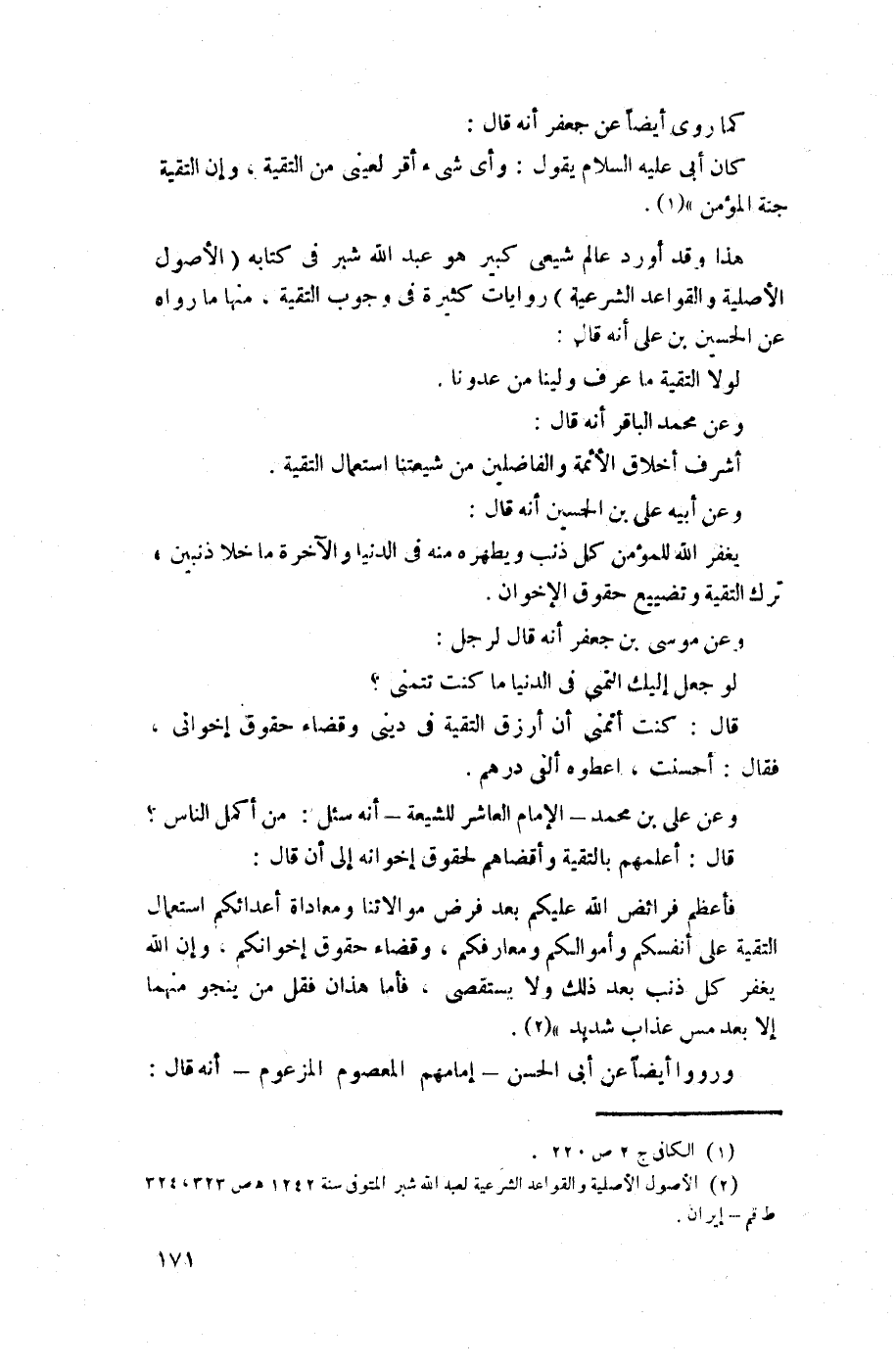 هذا وقد أورد عالم شيعي كبير هو عبد الله شبر في كتابه (الأصول الأصيلة والقواعد الشرعية) روايات كثيرة في وجوب التقية، منها ما رواه عن الحسين بن علي أنه قال: