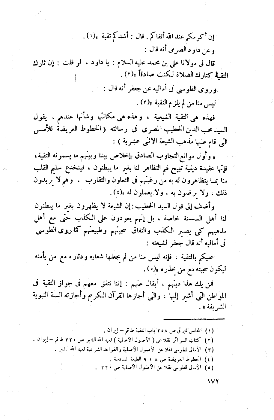 "وأول موانع التجاوب الصادق بإخلاص بيننا وبينهم ما يسمونه التقية، فإنها عقيدة دينية تبيح لهم التظاهر لنا بغير ما يبطنون، فينخدع سليم القلب منا بما يتطاهرون له به من رغبتهم في التعاون والتقارب، وهم لا يريدون ذلك، ولا يرضون به، ولا يعملون له" (¬4).