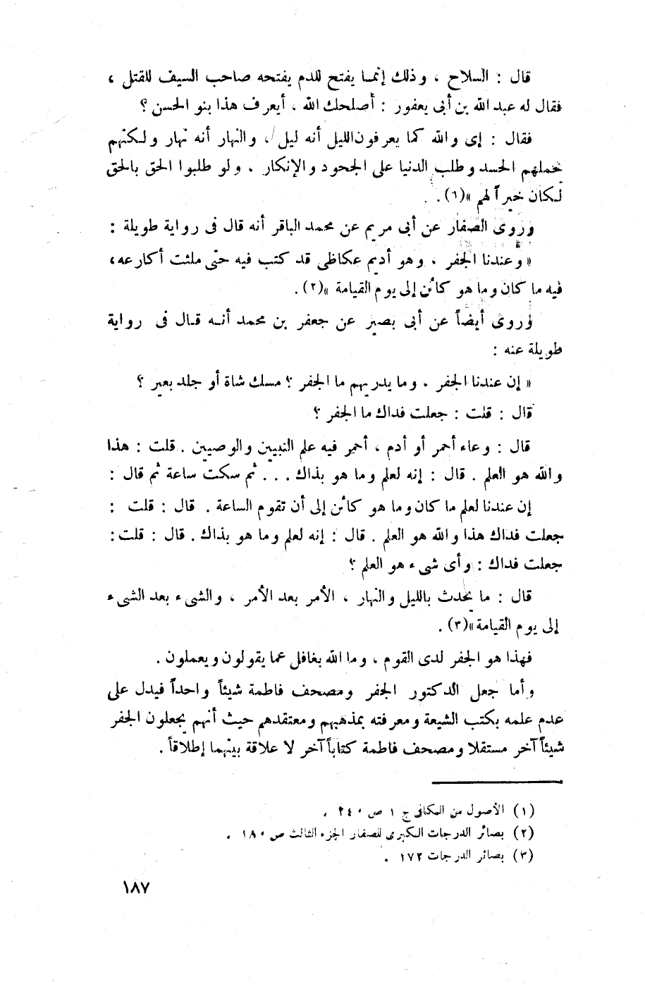 وأما جعل الدكتور الجفر ومصحف فاطمة شيئاً واحداً فيدل على عدم علمه بكتب الشيعة ومعرفته بمذهبهم ومعتقدهم حيث أنهم يجعلون الجفر شيئاً آخر مستقلاً ومصحف فاطمة كتاباً آخر لا علاقة بينهما إطلاقاً.