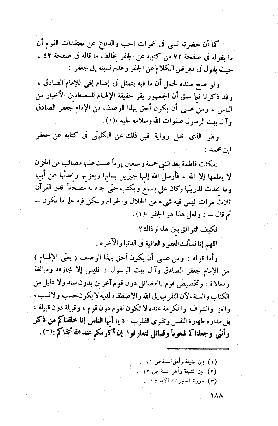 كما أن حضرته نسي في غمرات الحب والدفاع عن معتقدات القوم أن ما يقوله في صفحة 72 من كتيبه عن الجفر يخالف ما قاله في صفحة 43، حيث يقول في معرض الكلام عن الجفر وعدم نسبته إلى جعفر: