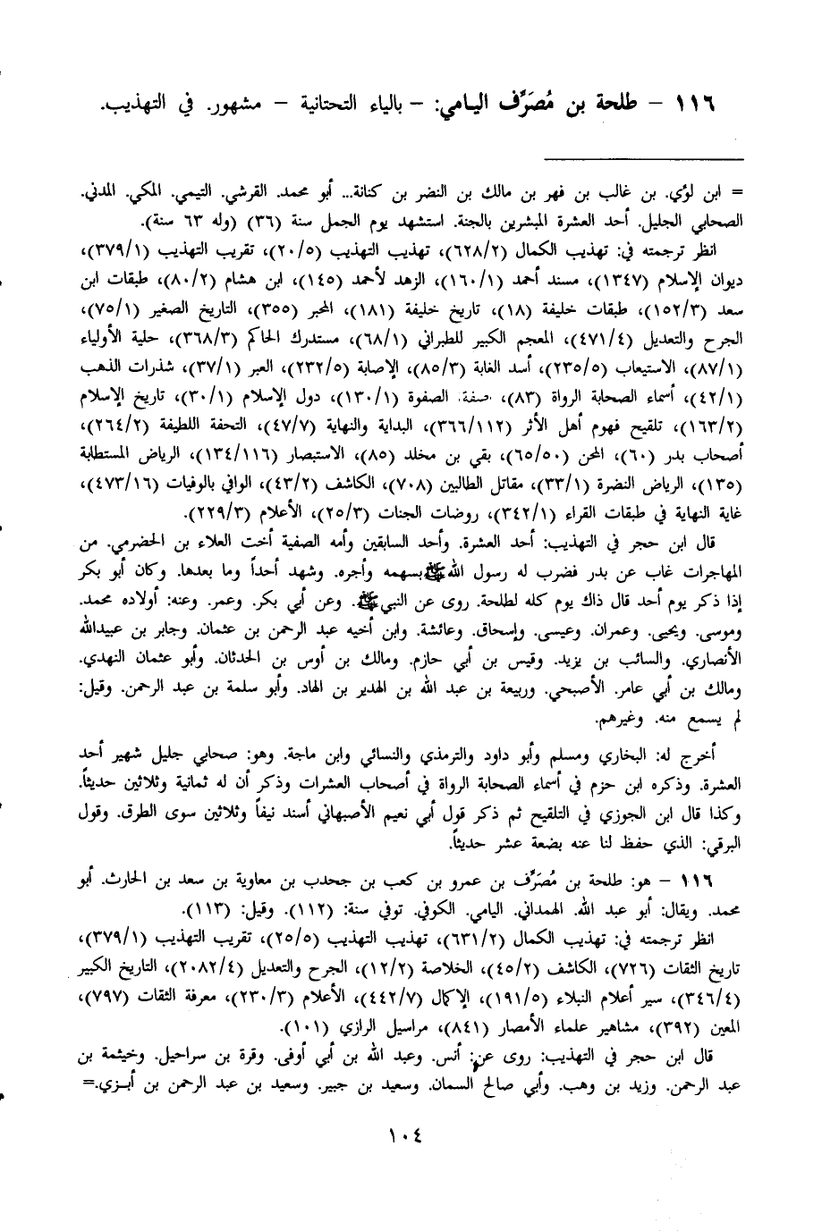 116 - طَلْحَة بن مصرف اليامي بِالْيَاءِ التَّحْتَانِيَّة مَشْهُور فِي التَّهْذِيب
