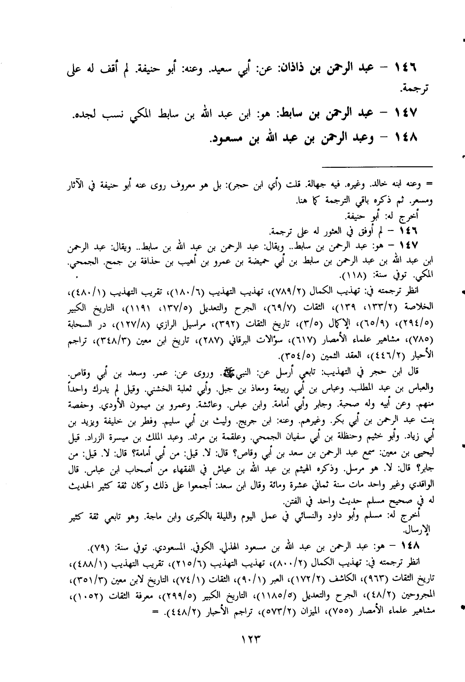 146 - عبد الرَّحْمَن بن ذاذان عَن أبي سعيد وَعنهُ أَبُو حنيفَة لم أَقف لَهُ على تَرْجَمَة
