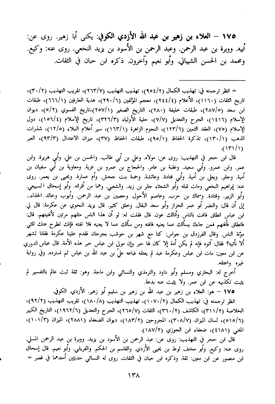 175 - الْعَلَاء بن زُهَيْر بن عبد الله الْأَزْدِيّ الْكُوفِي يكنى أَبَا زُهَيْر روى عَن أَبِيه ووبرة بن عبد الرَّحْمَن وَعبد الرَّحْمَن بن الْأسود بن يزِيد النَّخعِيّ روى عَنهُ وَكِيع وَمُحَمّد بن الْحسن الشَّيْبَانِيّ وَأَبُو نعيم وَآخَرُونَ ذكره ابْن حبَان فِي الثِّقَات