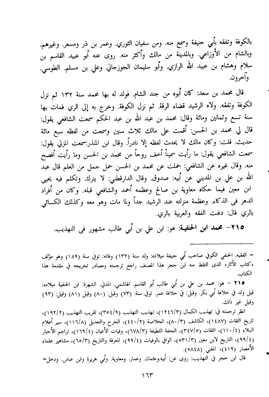 215 - مُحَمَّد ابْن الْحَنَفِيَّة هُوَ ابْن عَليّ بن أبي طَالب مَشْهُور فِي التَّهْذِيب