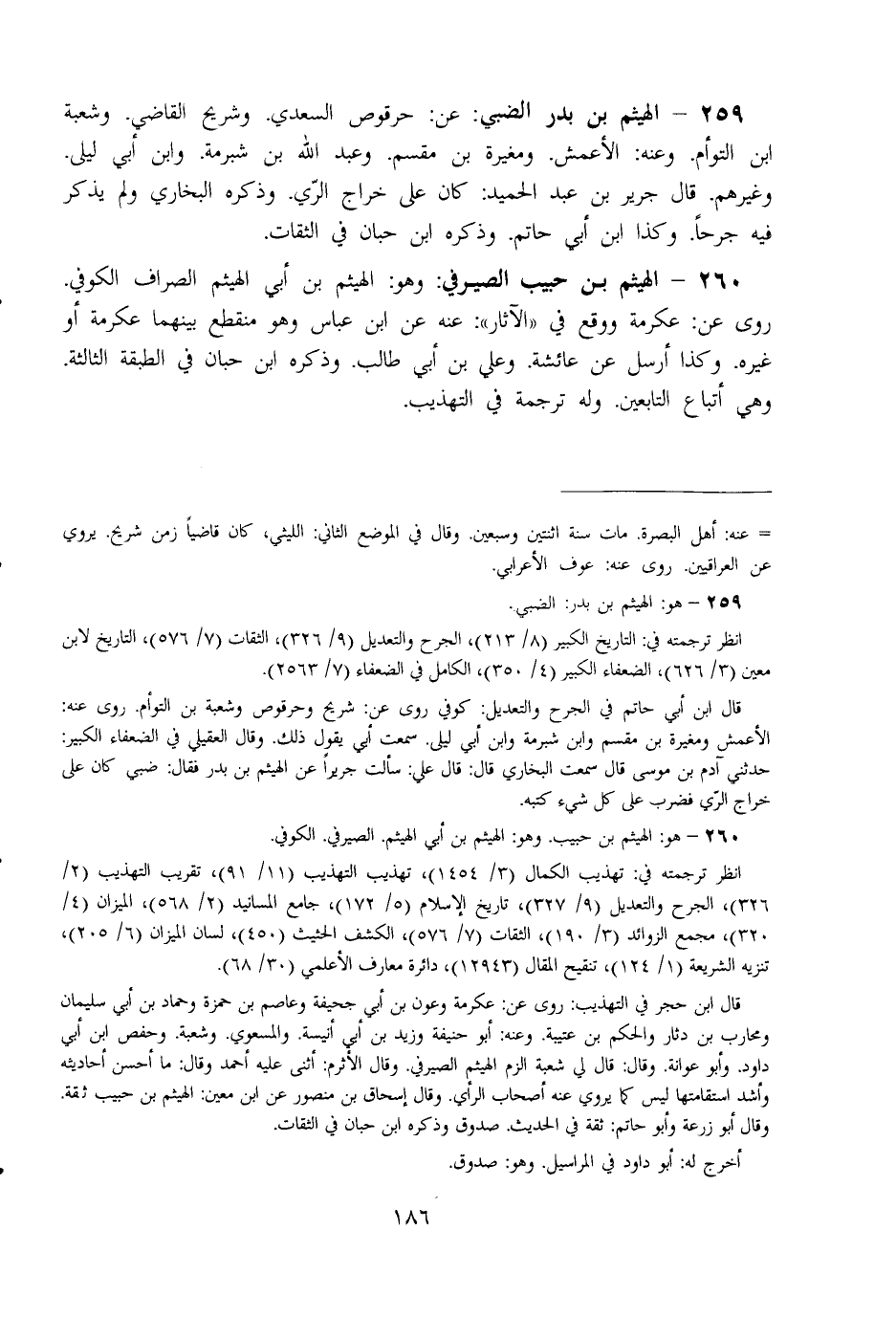 259 - الْهَيْثَم بن بدر الضَّبِّيّ عَن حرقوص السَّعْدِيّ وَشُرَيْح القَاضِي وَشعْبَة ابْن التوأم وَعنهُ الْأَعْمَش ومغيرة بن مقسم وَعبد الله بن شبْرمَة وَابْن أبي ليلى وَغَيرهم قَالَ جرير بن عبد الحميد كَانَ على خراج الرّيّ وَذكره البُخَارِيّ وَلم يذكر فِيهِ جرحا وَكَذَا ابْن أبي حَاتِم وَذكره ابْن حبَان فِي الثِّقَات