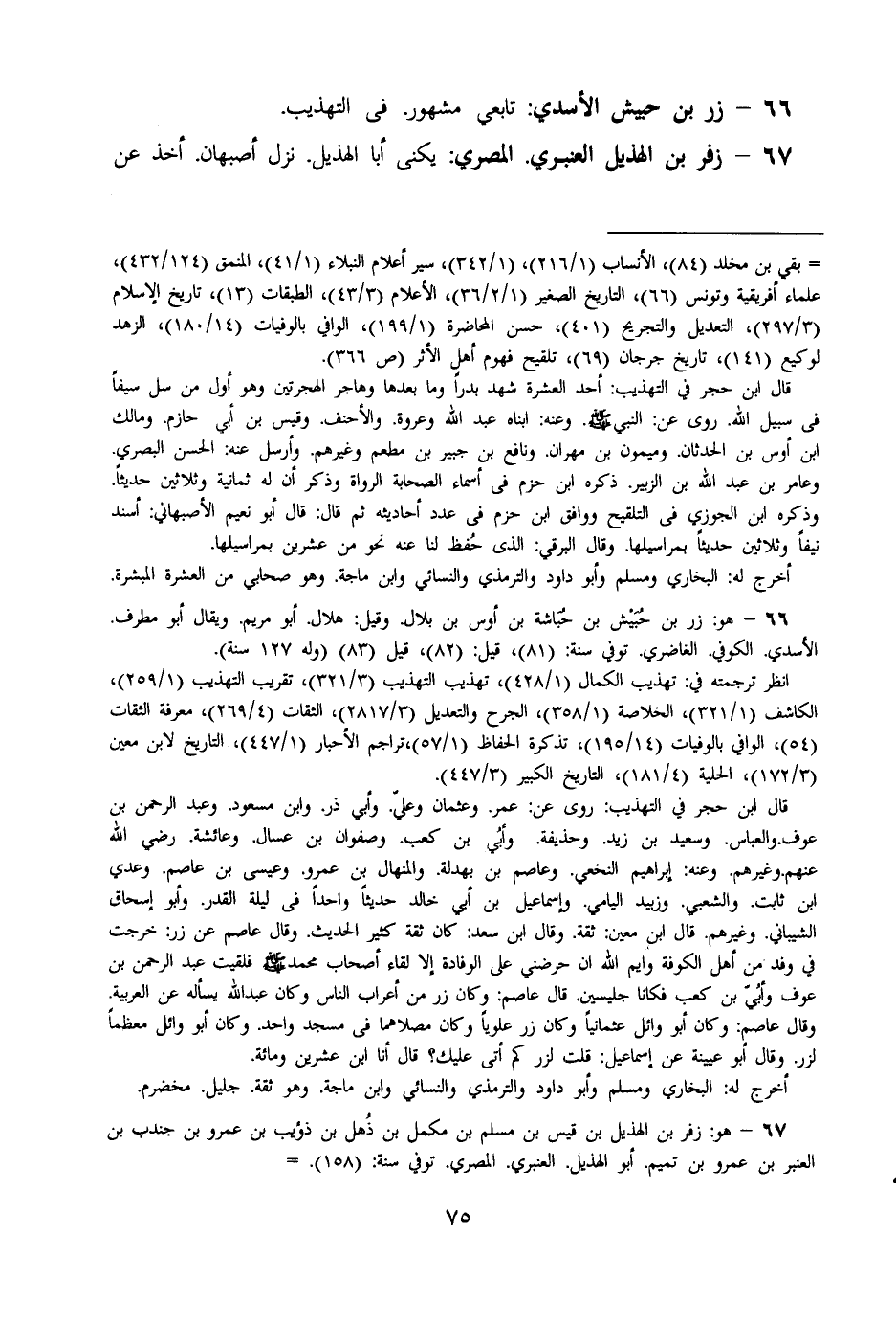 66 - زر بن حُبَيْش الْأَسدي تَابِعِيّ مَشْهُور فِي التَّهْذِيب