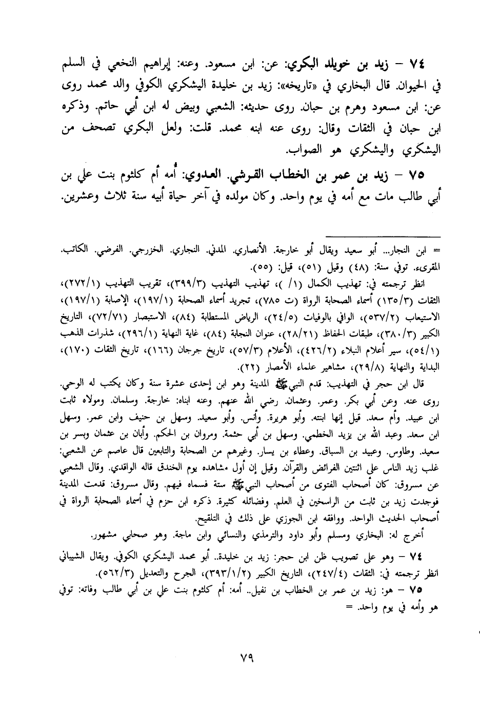 74 - زيد بن خويلد الْبكْرِيّ عَن ابْن مَسْعُود وَعنهُ إِبْرَاهِيم النَّخعِيّ فِي السّلم فِي الْحَيَوَان قَالَ البُخَارِيّ فِي تَارِيخه زيد بن خليدة الْيَشْكُرِي الْكُوفِي وَالِد مُحَمَّد روى عَن ابْن مَسْعُود وهرم بن حبَان روى حَدِيثه الشّعبِيّ وبيض لَهُ ابْن أبي حَاتِم وَذكره ابْن حبَان فِي الثِّقَات وَقَالَ روى عَنهُ ابْنه مُحَمَّد قلت وَلَعَلَّ الْبكْرِيّ تصحف من الْيَشْكُرِي واليشكري هُوَ الصَّوَاب