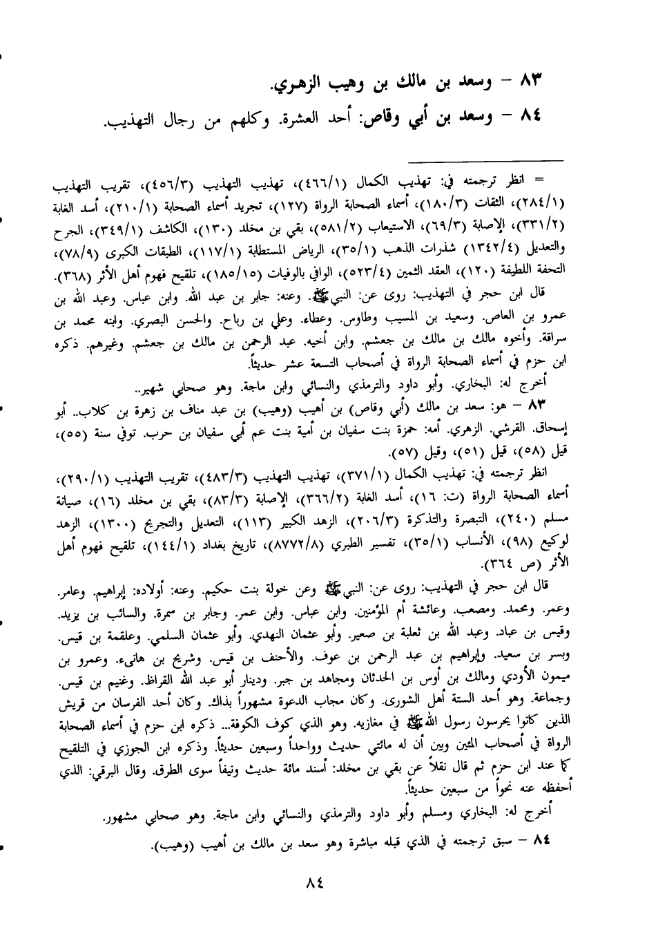 84 - وَسعد بن أبي وَقاص أحد الْعشْرَة وَكلهمْ من رجال التَّهْذِيب