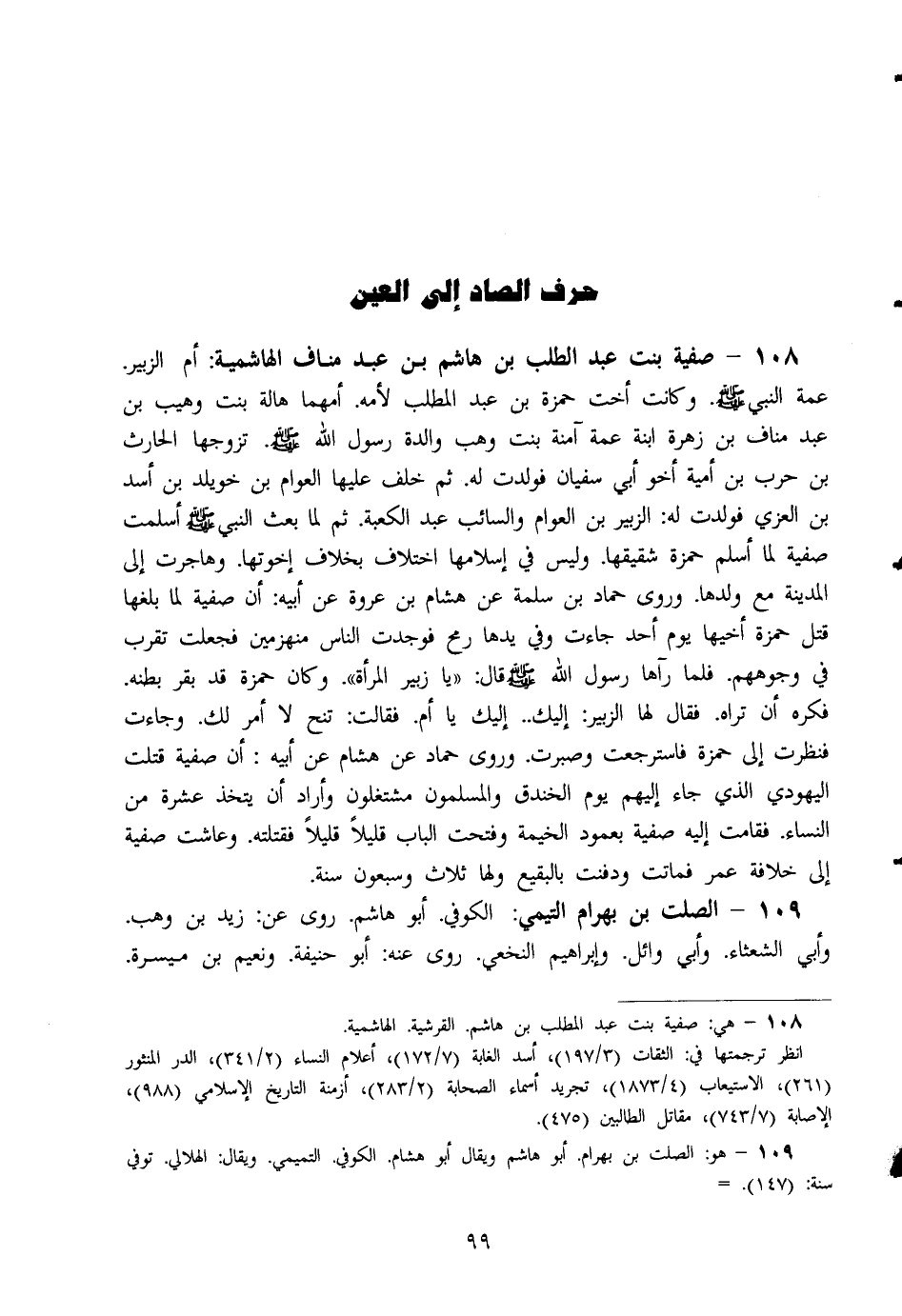108 - صَفِيَّة بنت عبد الْمطلب بن هَاشم بن عبد منَاف الهاشمية أم الزبير عمَّة النَّبِي صلى الله عَلَيْهِ وَسلم وَكَانَت أُخْت حَمْزَة بن عبد الْمطلب لأمه أمهما هَالة بنت وهيب بن عبد منَاف بن زهرَة ابْنة عمَّة آمِنَة بنت وهب وَالِدَة رَسُول الله صلى الله عَلَيْهِ وَسلم تزَوجهَا الْحَارِث بن حَرْب بن أُميَّة أَخُو أبي سُفْيَان فَولدت لَهُ ثمَّ خلف عَلَيْهَا الْعَوام بن خويلد بن أَسد بن الْعزي فَولدت لَهُ الزبير بن الْعَوام والسائب عبد الْكَعْبَة ثمَّ لما بعث النَّبِي صلى الله عَلَيْهِ وَسلم أسلمت صَفِيَّة لما أسلم حَمْزَة شقيقها وَلَيْسَ فِي إسْلَامهَا اخْتِلَاف بِخِلَاف إخوتها وَهَاجَرت إِلَى الْمَدِينَة مَعَ وَلَدهَا وروى حَمَّاد بن سَلمَة عَن هِشَام بن عُرْوَة عَن أَبِيه أَن صَفِيَّة لما بلغَهَا قتل حَمْزَة أَخِيهَا يَوْم أحد جَاءَت وَفِي يَدهَا رمح فَوجدت النَّاس منهزمين فَجعلت تقرب فِي وُجُوههم فَلَمَّا رَآهَا رَسُول الله صلى الله عَلَيْهِ وَسلم قَالَ يَا زبير الْمَرْأَة وَكَانَ حَمْزَة قد بقر بَطْنه فكره أَن ترَاهُ فَقَالَ لَهَا الزبير إِلَيْك إِلَيْك يَا أم فَقَالَت تَنَح لَا أَمر لَك وَجَاءَت فَنَظَرت إِلَى حَمْزَة فاسترجعت وَصَبَرت وروى حَمَّاد عَن هِشَام عَن أَبِيه أَن صَفِيَّة قتلت الْيَهُودِيّ الَّذِي جَاءَ إِلَيْهِم يَوْم الخَنْدَق والمسلمون مشتغلون وَأَرَادَ أَن يتَّخذ عشرَة من النِّسَاء فَقَامَتْ إِلَيْهِ صَفِيَّة بعمود الْخَيْمَة وَفتحت الْبَاب قَلِيلا قَلِيلا فَقتلته وَعَاشَتْ صَفِيَّة إِلَى خلَافَة عمر فَمَاتَتْ ودفنت بِالبَقِيعِ وَلها ثَلَاث وَسَبْعُونَ سنة