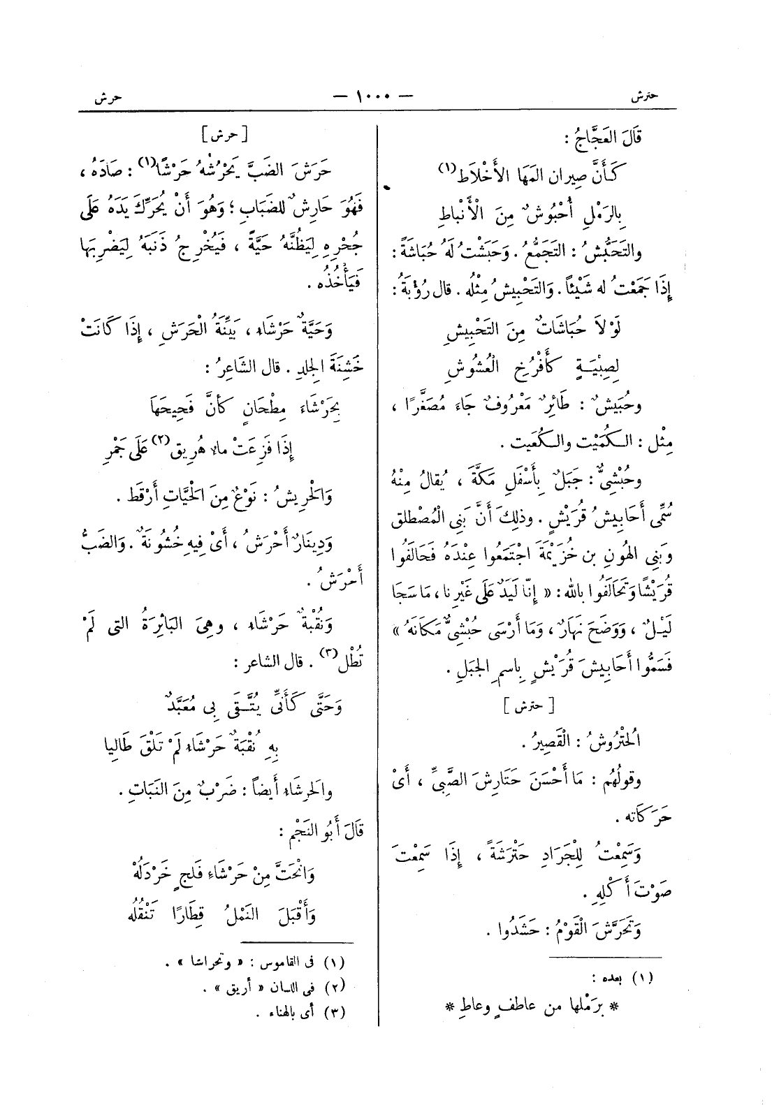 [حرش] حَرَشَ الضَبَّ يَحْرُشُهُ حَرْشاً (¬1) : صادَهُ، فَهُوَ حارِشٌ للضَبابِ ; وَهُوَ أن يحرك يده على جحره لِيَظُنَّهُ حَيَّةً، فَيُخْرِجُ ذَنَبَهُ لِيَضْرِبَها فَيأْخُذُه. وَحَيَّةٌ حَرْشاءُ، بَيِّنَةُ الحَرَشِ، إذَا كَانَتْ خَشِنَةَ الجِلدِ. قال الشاعِرُ: بِحَرْشاَء مِطْحانٍ كأنَّ فَحيحَها * إذَا فَزِعَتْ ماءٌ هرِيق (¬2) عَلى جمر * والحريش: نوع من الحيات أرقط. ودينار أحرش، أي فيه خَشونَةٌ. والضبٌّ أَحْرَشُ. وَنُقْبَةٌ حَرْشاءُ، وهيَ البائِرَةُ التي لَمْ تُطْل (¬3) . قال الشاعر: وَحَتَّى كَأَنِّي يُتَّقى بي مُعَبَّدٌ * بِهِ نُقْبَةٌ حَرشاءُ لم تلق طاليا * والحرشاء أيضا: ضرب من النبات. قال أبو النجم: وانحت من حرشاء فلج خردله * وأقبل النمل قطارا تنقله *