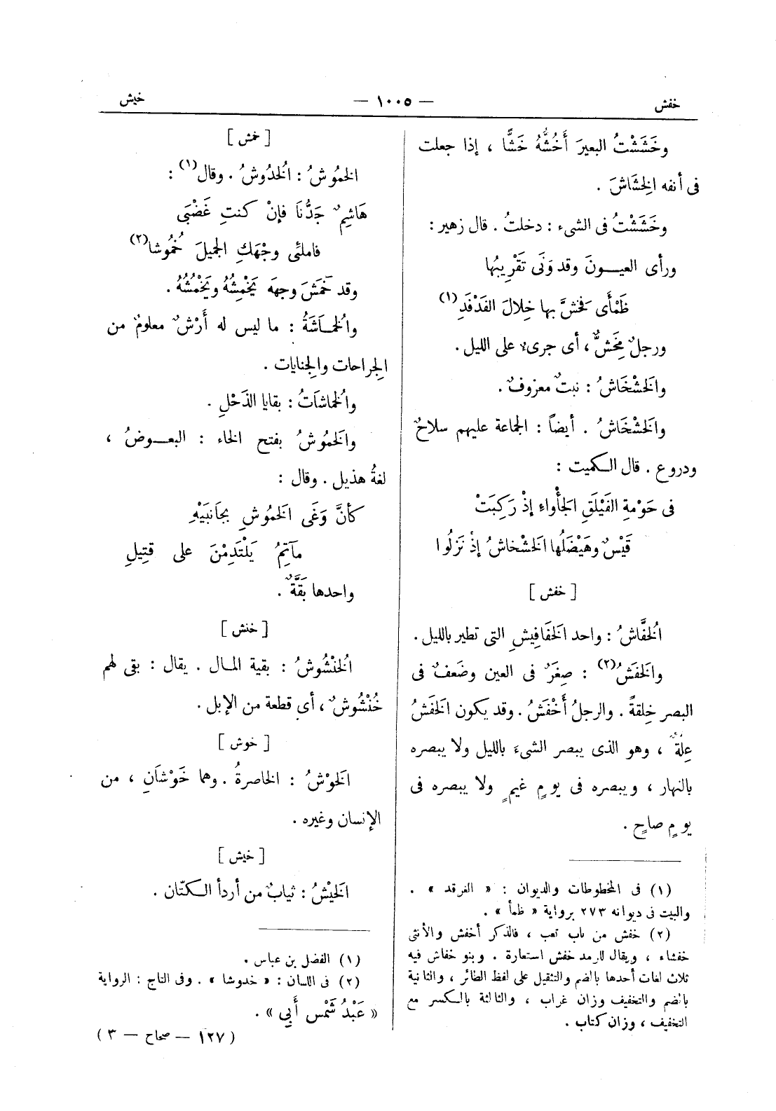 وخششت البعير أخشه خَشَّاً، إذا جعلت في أنفه الخشاش. وخششت في الشئ: دخلت. قال زهير: ورأى العيونَ وقد ونى تقربها * ظمأى فخش بها خِلالَ الفَدْفَدِ (¬1) * ورجل مِخَشٌّ، أي جرئ على الليل. والخشخاش: نبت معروف. والخشخاش: أيضاً: الجماعة عليهم سلاحٌ ودروع. قال الكميت: في حَوْمةِ الفَيْلَقِ الجأْواءِ إذْ رَكِبَتْ * قَيْسٌ وهَيْضَلُها الخشخاش إذ نزلوا