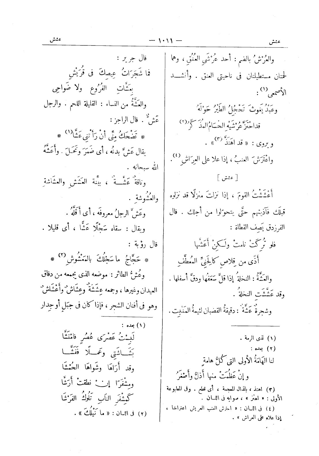 [عشش] أعْشَشْتُ القومَ، إذا نزلتَ منزلاً قد نزلوه قبلك فآذيتهم حتَّى يتحوَّلوا من أجلك. قال الفرزدق يصف القطاة: فلو تُركتْ نامتْ ولكن أعَشَّها * أذى من قِلاصٍ كالحنيِّ المُعطَّفِ * والعَشَّةُ: النخلةُ إذا قلَّ سَعَفُها ودقَّ أسفلها. وقد عَشَّشَتِ النخلةُ. وشجرةٌ عَشَّةٌ: دقيقة القضبان لئيمة المنبت.