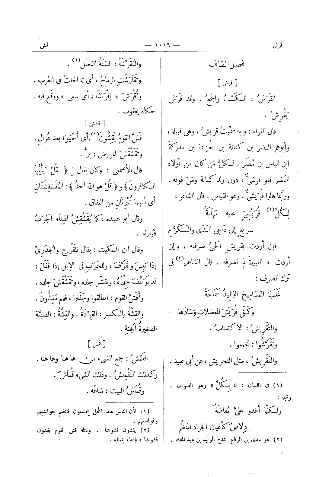 [قرش] القَرْشُ: الكسبُ والجمعُ. وقد قرش يقرش. قال الفراء: وبه سميت قريش، وهى قبيلة، وأبوهم النضر بن كنانة بن خزيمة بن مدركة ابن الياس بن مضر. فكل من كان من أولاد النضر فهو قرشي، دون ولد كنانة ومن فوقه. وربما قالوا قريشي. وهو القياس. قال الشاعر: لكل (¬1) قريشي عليه مهابة * سريع إلى داعى الندى والتكرم * فإن أردت بقريش الحى صرفته، وإن أردت به القبيلة لم تصرفه. قال الشاعر (¬2) في ترك الصرف: غلب المساميح الوليد سماحة * وكفى قريش المعضلات وسادها * والتقريش: الاكتساب. وتقرشوا: تجمعوا. والتقريش، مثل التحريش، عن أبى عبيد.
