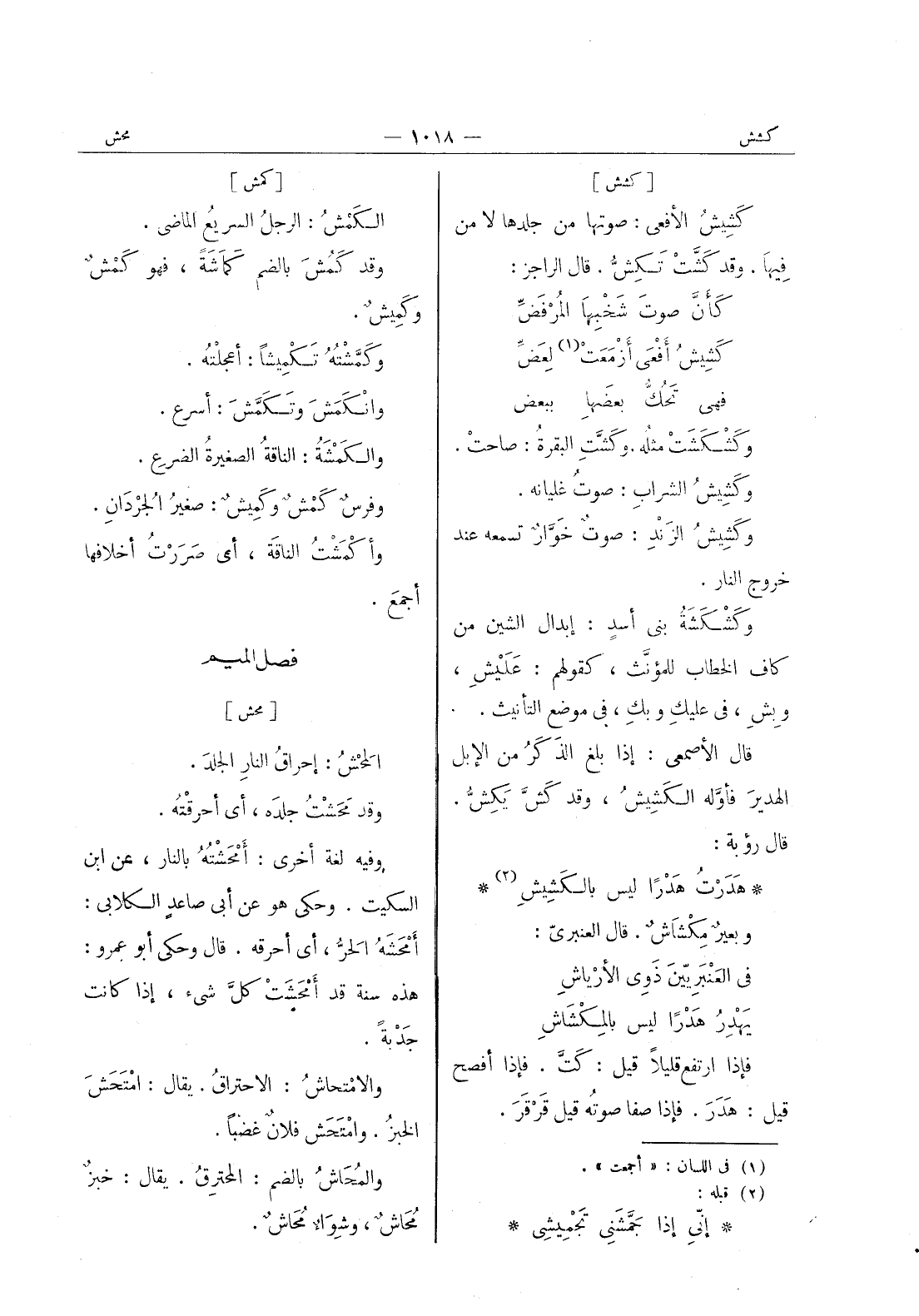 [كشش] كَشيشُ الأفعى: صوتها من جلدها لا من فِيها. وقد كشت تكش. قال الراجز: كأن صوت شخبها المرفض * كشيش أفعى أزمعت (¬1) لعض * فهى تحك بعضها ببعض * وكشكشت مثله. وكشت البقرة: صاحت. وكشيش الشراب: صوت غليانه. وكَشيشُ الزَنْدِ: صوتٌ خَوَّارٌ تسمعه عند خروج النار. وكشكشة بنى أسد: إبدال الشين من كاف الخطاب للمؤنث، كقولهم: عليش، وبش، في عليك وبك، في موضع التأنيث. قال الأصمعيّ: إذا بلغ الذَكَرُ من الإبل الهديرَ فأوَّله الكَشيشُ، وقد كَشَّ يَكِشُّ. قال رؤبة: