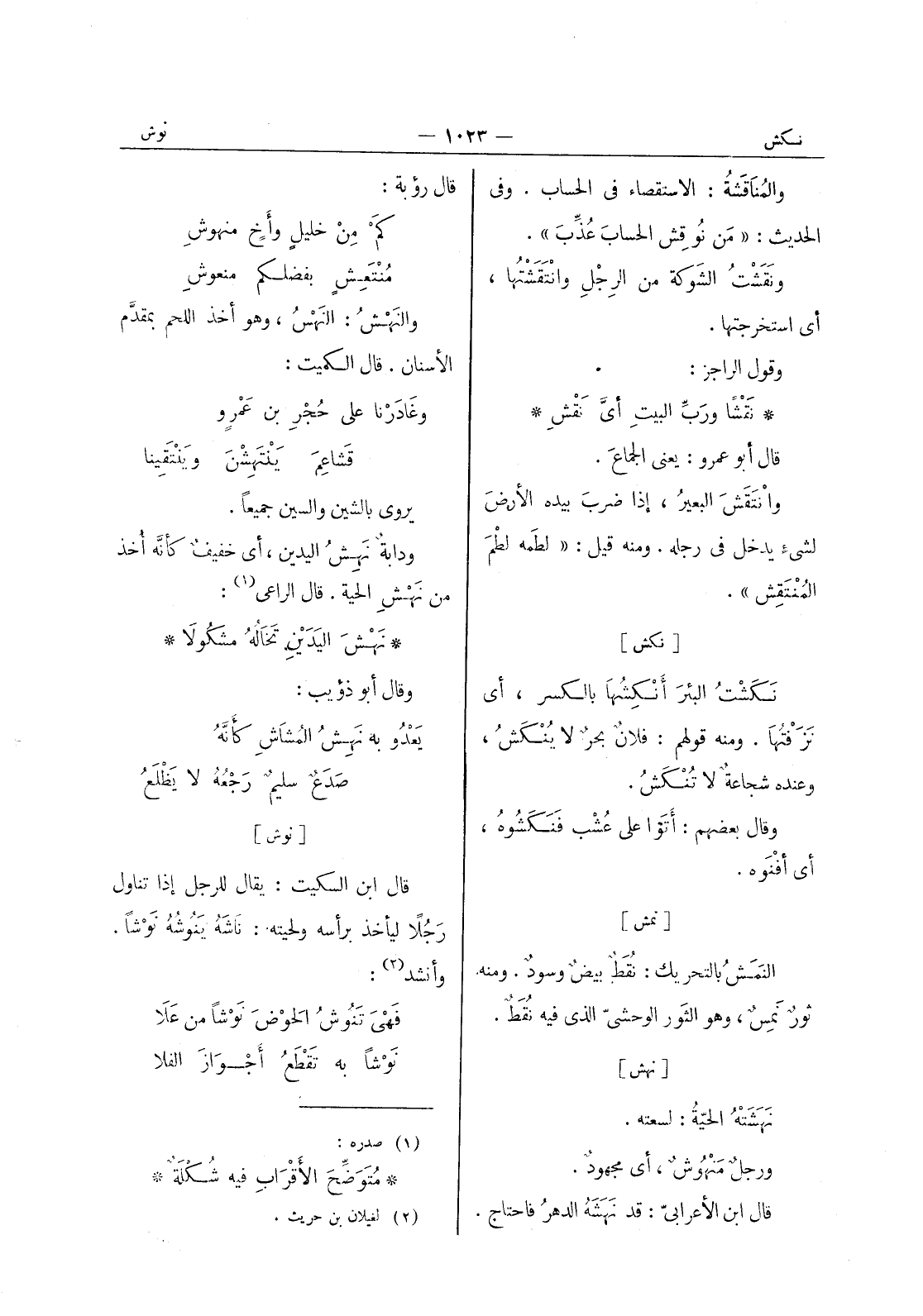 قال رؤبة: كمْ من خليلٍ وأَخٍ منهوشِ * مُنْتَعِشٍ بفضلكم منعوشِ * والنَهْشُ: النَهْسُ، وهو أخذ اللحم بمقدَّم الأسنان. قال الكميت: وغادَرْنا على حُجْرِ بن عمرٍو * قَشاعِمَ يَنْتَهِشْنَ ويَنْتَقينا * يروى بالشين والسين جميعاً. ودابَّةٌ نَهِشُ اليدين، أي خفيفٌ كأنَّه أُخذ من نَهْشِ الحية. قال الراعي (¬1) :