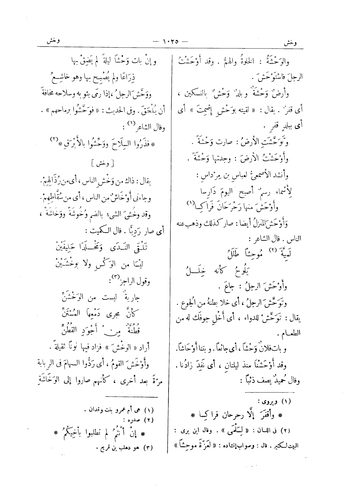 والوحشة: الخلوة والهمُّ. وقد أوْحَشْتُ الرجلَ فاسْتَوْحَشَ. وأرضٌ وَحْشَةٌ وبلدٌ وَحْشٌ بالتسكين، أي قفر. يقال " لقيته بوحش إصمت " أي أي ببلد قفر. وتوحشت الارض: صارت وَحْشَةً. وأوْحَشْتُ الأرضَ: وجدتها وَحْشَةً. وأنشد الاصمعي لعباس بن مرداس: لاسماء رسم أصبح اليوم دارسا * وأوحش منها رحرحان فراكسا (¬1) * وأوْحَشَ المنزل أيضاً: صار كذلك وذهب عنه الناس. قال الشاعر: لمية (¬2) موحشا طلل * يلوح كأنه خلل * وأوحش الرجل: جاعَ. وتَوَحَّشَ الرجلُ، أي خلا بطنُه من الجوع. يقال: تَوَحَّشْ للدواء، أي أخل جوفك له من الطعام. وبات فلانٌ وَحْشاً، أي جائعاً. وبتنا أوْحاشاً. وقد أوْحَشْنا منذ ليلتان، أي نفد زادنا. وقال حميد يصف ذئبا