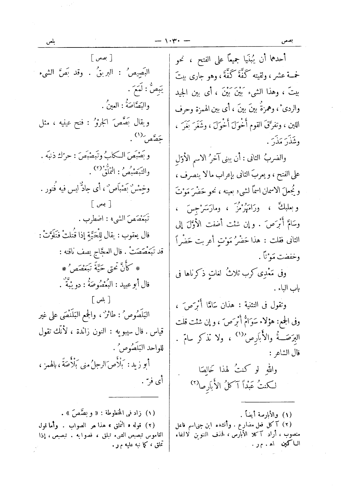 [بلص] البَلصوص: طائرٌ، والجمع البَلَنْصى على غير قياس. قال سيبويه: النون زائدة، لانك تقول للواحد البلصوص. أبو زيد: بَلأَصَ الرجلُ مني بَلْأَصَةً، بالهمز، أي فر.