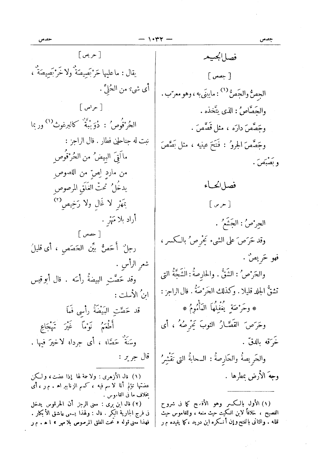 [جصص] الجِصُّ والجَصُّ (¬1) : ما يبنَى به، وهو معرب. والجصاص: الذى يتخذه. وجصص دراه، مثل قَصَّصَ. وجَصَّصَ الجروُ: فَتَحَ عينيه، مثل بصص وبصبص.