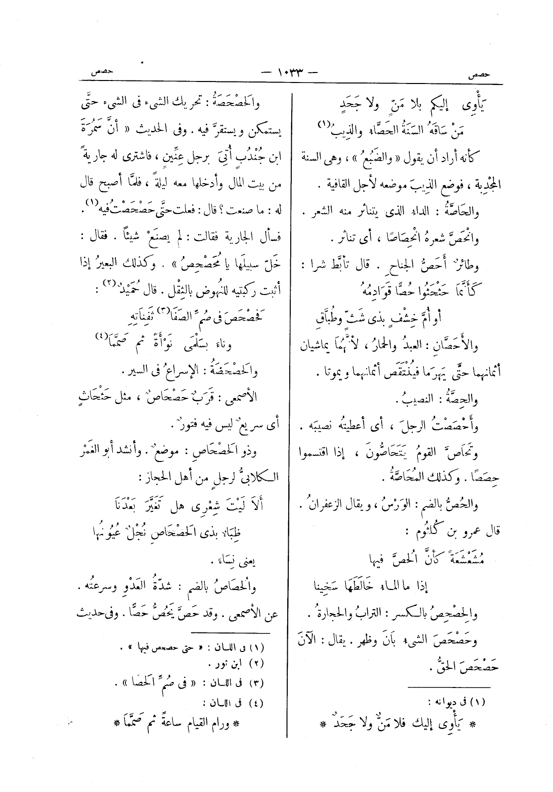 والحصحصة: تحريك الشئ في الشئ حتى يستمكن ويستقرَّ فيه. وفي الحديث " أنَّ سَمُرَةَ ابن جُنْدُبٍ أُتِيَ برجل عِنِّينٍ، فاشترى له جاريةً من بيت المال وأدخلها معه ليلةً، فلمَّا أصبح قال له: ما صنعت؟ قال: فعلت حتَّى حَصْحَصْتُ فيه (¬1) . فسأل الجارية فقالت: لم يصنَعْ شيئاً. فقال: خَلّ سبيلَها يا مُحَصْحِصُ ". وكذلك البعيرُ إذا أثبت ركبتيه للنهوض بالثقل. قال حميد (¬2) : فحصحص في صم الصفا (¬3) ثفناته * وناء بسَلْمى نوأةً ثم صَمَّما * (¬4) والحصحصة: الإسراعُ في السير. الأصمعي: قَرَبٌ حَصْحاصٌ، مثل حَثْحاثٍ أي سريعٌ ليس فيه فتور. وذو الحصحاص: موضع. وأنشد أبو الغمر الكلابي لرجل من أهل الحجاز: ألا ليت شعرى هل تغير بعدنا * ظباء بذى الحصحاص نجل عيونها * يعنى نساء. والحصاص بالضم: شدة العدو وسرعته. عن الاصمعي. وقد حص يحص حصا. وفى حديث