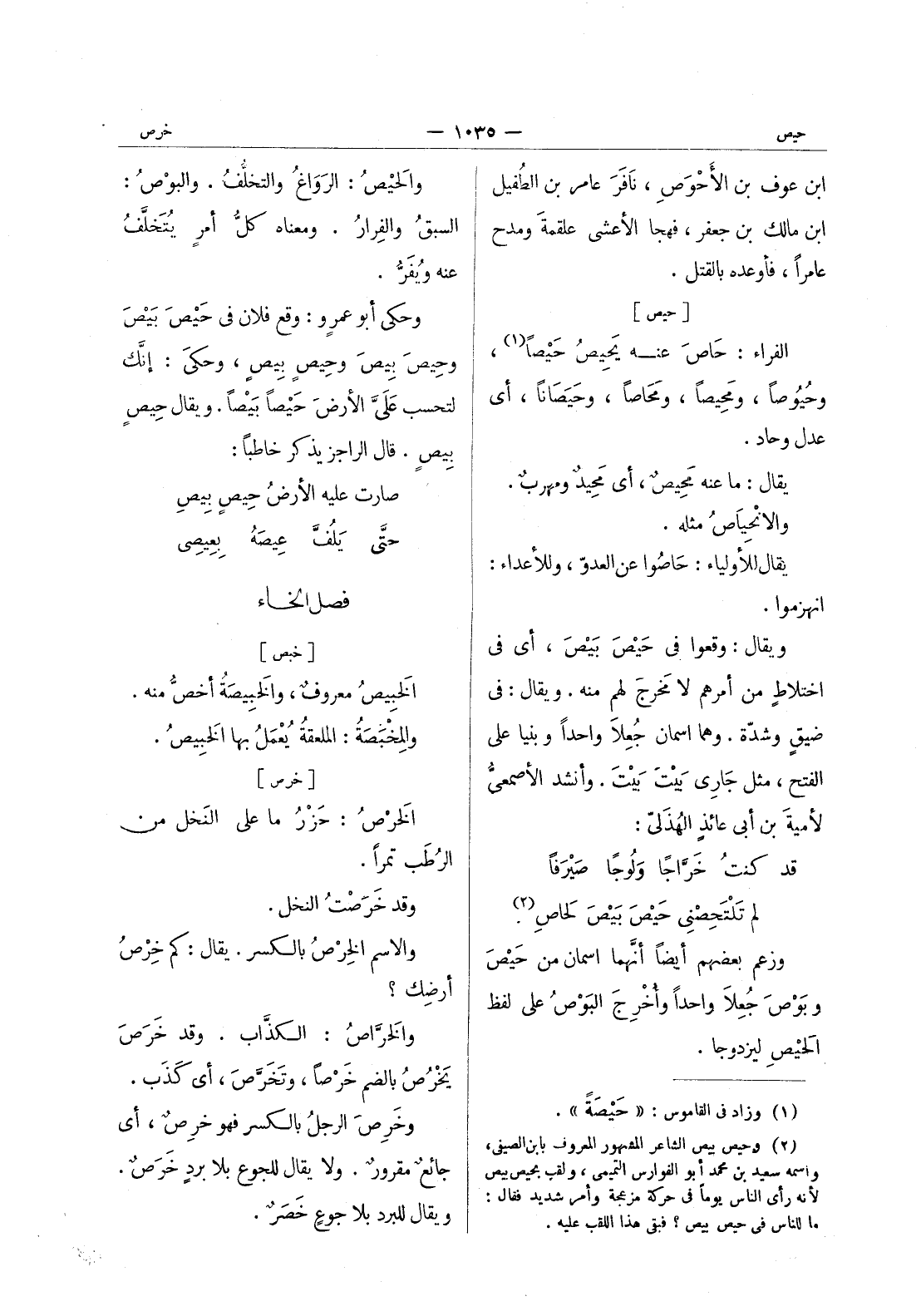 [حيص] الفراء: حاص عنه يحيص حَيْصاً (¬1) ، وحُيوصاً، ومَحيصاً، ومَحاصاً، وحَيَصاناً، أي عدل وحاد. يقال: ما عنه مَحيصٌ، أي مَحيدٌ ومهربٌ. والانْحِياصُ مثله. يقال للأولياء: حاصُوا عن العدوّ، وللأعداء: انهزموا. ويقال: وقعوا في حَيْصَ بَيْصَ، أي في اختلاطٍ من أمرهم لا مَخرجَ لهم منه. ويقال: في ضيق وشدة. وهما اسمان جعلا واحدا وبنيا على الفتح، مثل جارى بيت بيت. وأنشد الاصمعي لامية بن أبى عائذ الهذلى: قد كنت خراجا ولوجا صيرفا * لم تلتحصنى حيص بيص لحاص (¬2) *. وزعم بعضهم أيضا أنهما اسمان من حيص وبوص جعلا واحدا وأخرج البوص على لفظ الحيص ليزدوجا.