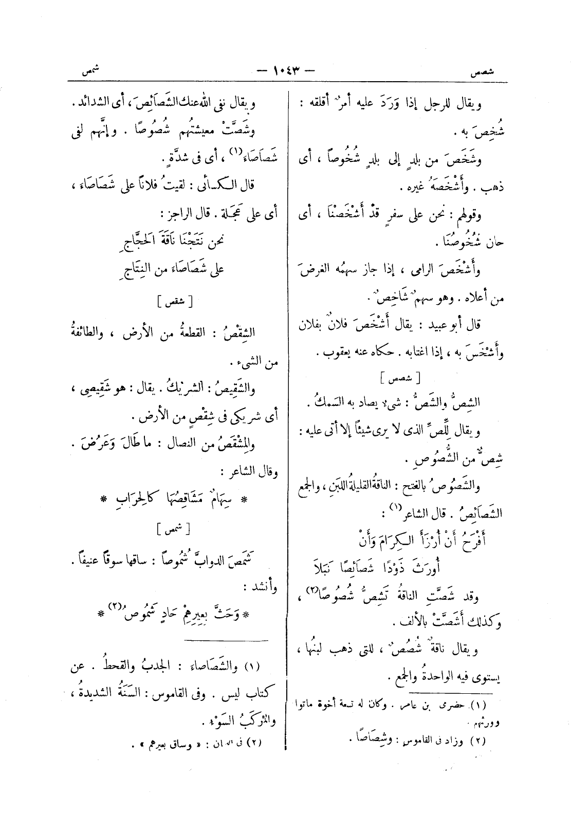 [شصص] الشص والشص: شئ يصاد به السَمَكُ. ويقال لِلِّصِّ الذي لا يرى شيئاً إلا أتى عليه: شِصٌّ من الشُّصوصِ. والشَصوصُ بالفتح: الناقةُ القليلةُ اللبَنِ، والجمع الشَصائِصُ. قال الشاعر (¬1) : أَفْرَحُ أَنْ أُرْزَأَ الكِرَامَ وَأَنْ * أُورَثَ ذَوْداً شَصائِصاً نَبَلاَ * وقد شَصَّتِ الناقةُ تشص شصوصا (¬2) ، وكذلك أشصت بالالف. ويقال ناقةٌ شُصُصٌ، للتي ذهب لبنُها، يستوى فيه الواحدة والجمع.