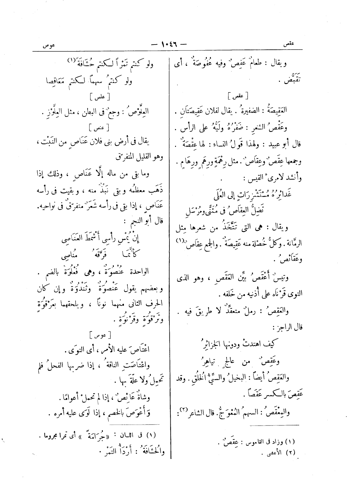 [عقص] العَقيصَةُ: الضفيرةُ. يقال لفلان عَقيصَتانِ. وعَقْصُ الشعرِ: ضَفْرُهُ ولَيُّهُ على الرأس. قال أبو عبيد: ولهذا قول النساءِ: لها عِقْصَةٌ. وجمعها عقص وعقاص. مثل رهمة ورهم ورهام. وأنشد لامرئ القيس: غَدائِرُهُ مُسْتَشْزِراتٍ إلى العُلى * تَضِلُّ العِقاصُ في مثنًى ومُرسَلِ * ويقال: هي التي تتَّخذ من شعرها مثل الرمَّانة. وكلُّ خُصلة منه عَقيصَةٌ. والجمع عِقاصٌ (¬1) وعَقائِصُ. وتيسٌ أعْقَصُ بيِّن العَقَصِ، وهو الذي التوى قرناه على أذنيه من خلفه. والعَقِصُ: رملٌ متعقِّدٌ لا طريقَ فيه. قال الراجز: كيف اهتدتْ ودونها الجَزائِرُ * وعَقِصٌ من عالجٍ تياهِرُ * والعَقِصُ أيضاً: البخيل والسيئ الخلق. وقد عقص بالكسر عَقَصاً. والمِعْقَصُ: السهم المعوجُّ. قال الشاعر (¬2)