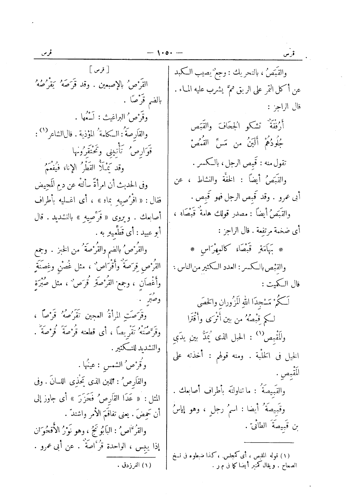 بهامة قبصاء كالمهراس * والقِبْص بالكسر: العدد الكثير من الناس: قال الكميت: لكم مسجِدا اللهِ المَزُورانِ والحَصى * لكم قِبْصُهُ من بين أثرى وأقترا * والمقبص (¬1) : الحبل الذي يمدُّ بين يدي الخيل في الحلبة. ومنه قولهم: أخذته على المقبص. والقبيصة: ما تناولته بأطراف أصابعك. وقبيصة أيضا: اسم رجل، وهو إياس بن قبيصة الطائى.