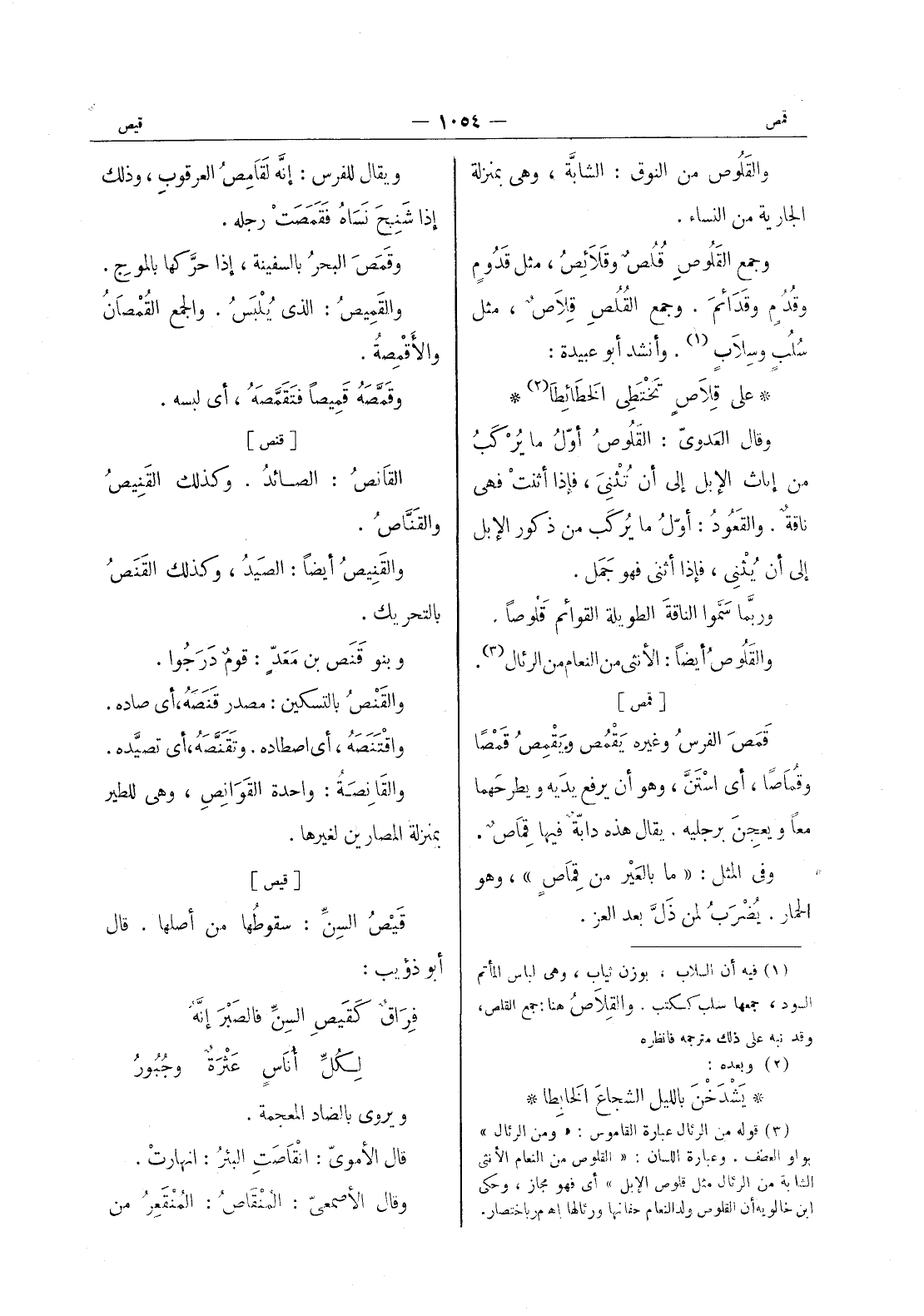 [قيص] قَيْصُ السِنِّ: سقوطَها من أصلها. قال أبو ذؤيب: فِراقٌ كَقَيْصِ السِنِّ فالصَبْرَ إنَّهُ * لكلِّ أُناسٍ عَثْرَةٌ وجُبورُ * ويروى بالضاد المعجمة. قال الأمويّ: انْقاصَتِ البئرُ: انهارتْ. وقال الأصمعيّ: المُنْقاصُ: المُنْقَعِرُ من