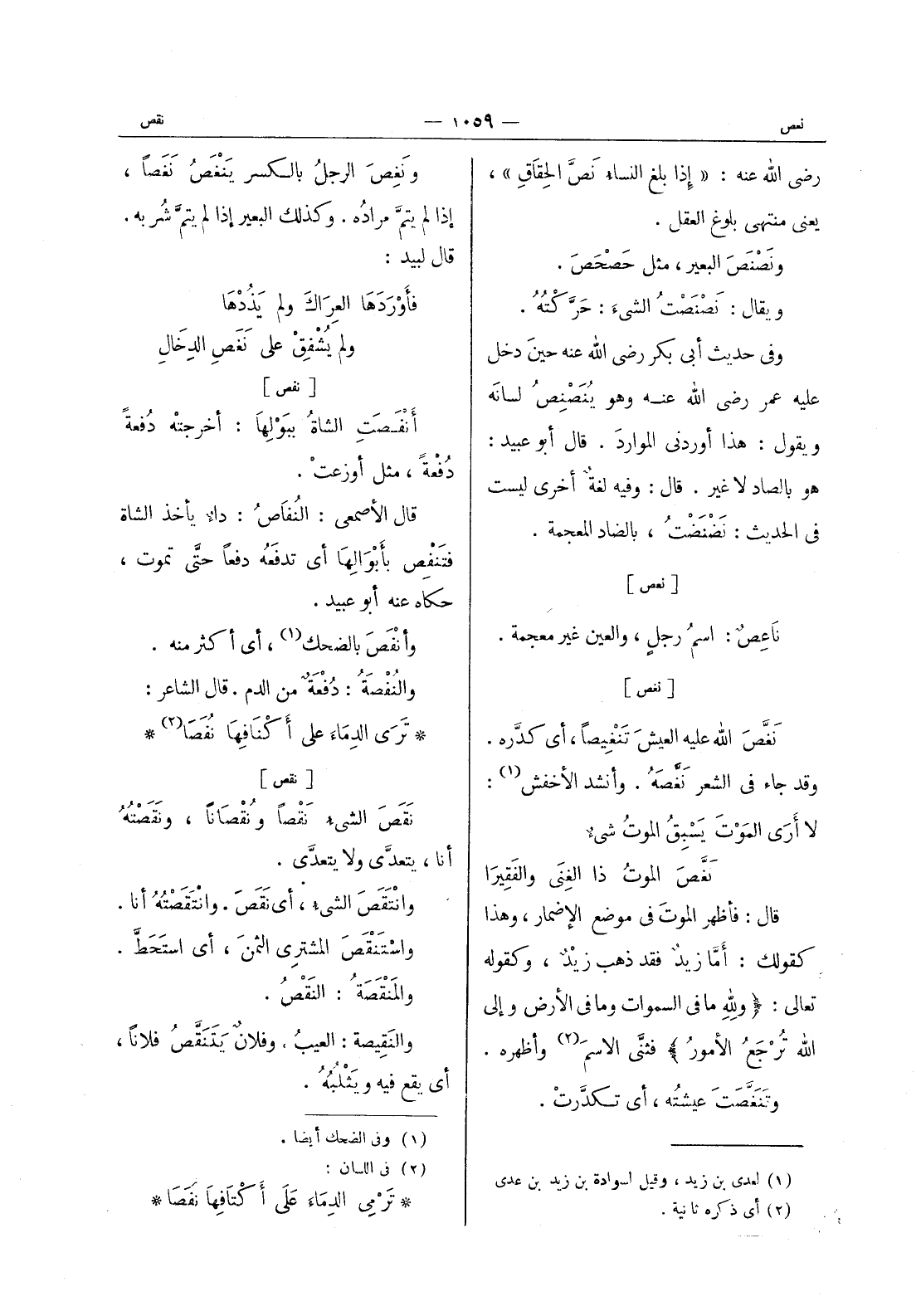 [نفص] أَنْفَصَتِ الشاةُ ببوْلِها: أخرجته دُفْعَةً دُفْعَةً، مثل أوزعتْ. قال الأصمعيّ: النُفاصُ: داءٌ يأخذ الشاة فتنفص بأبوالها أي تدفعه دفعا حتى تموت، حكاه عنه أبو عبيد. وأنفص بالضحك (¬1) ، أي أكثر منه. والنُفْصَةُ: دُفْعَةٌ من الدم. قال الشاعر: