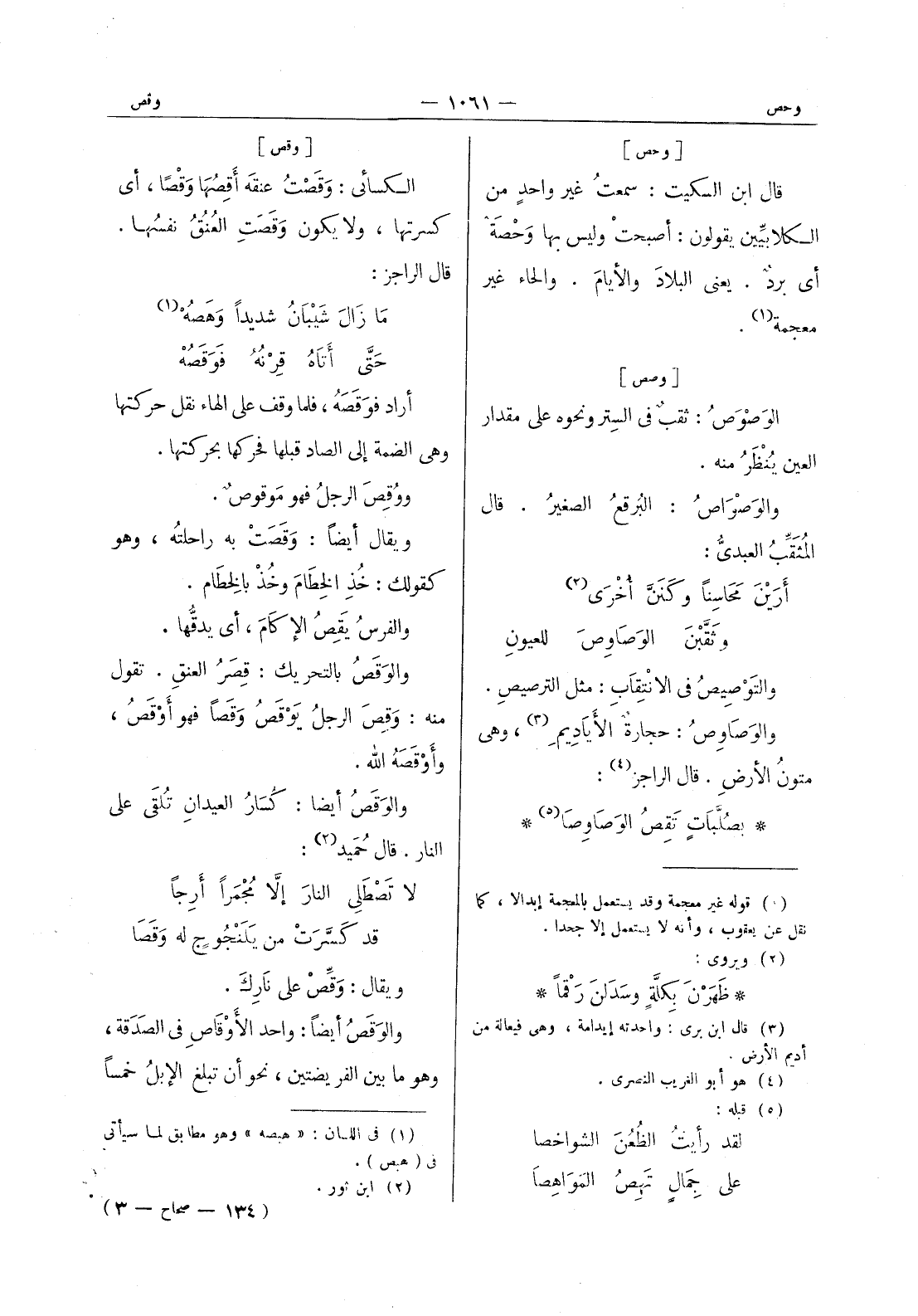 [وصص] الوصوص: ثقب في الستر ونحوه على مقدار العين يُنْظَرُ منه. والوَصْواصُ: البُرقعُ الصغيرُ. قال المُثَقٍّبُ العبديُّ: أَرَيْنَ مَحاسِناً وكَنَنَّ أخرى (¬2) * وثقبن الوصاوص للعيون * والتوصيص في الانتقاب: مثل الترصيص. والوصاوص: حجارة الأياديم (¬3) ، وهي متونِ الأرضِ. قال الراجز (¬4) :
