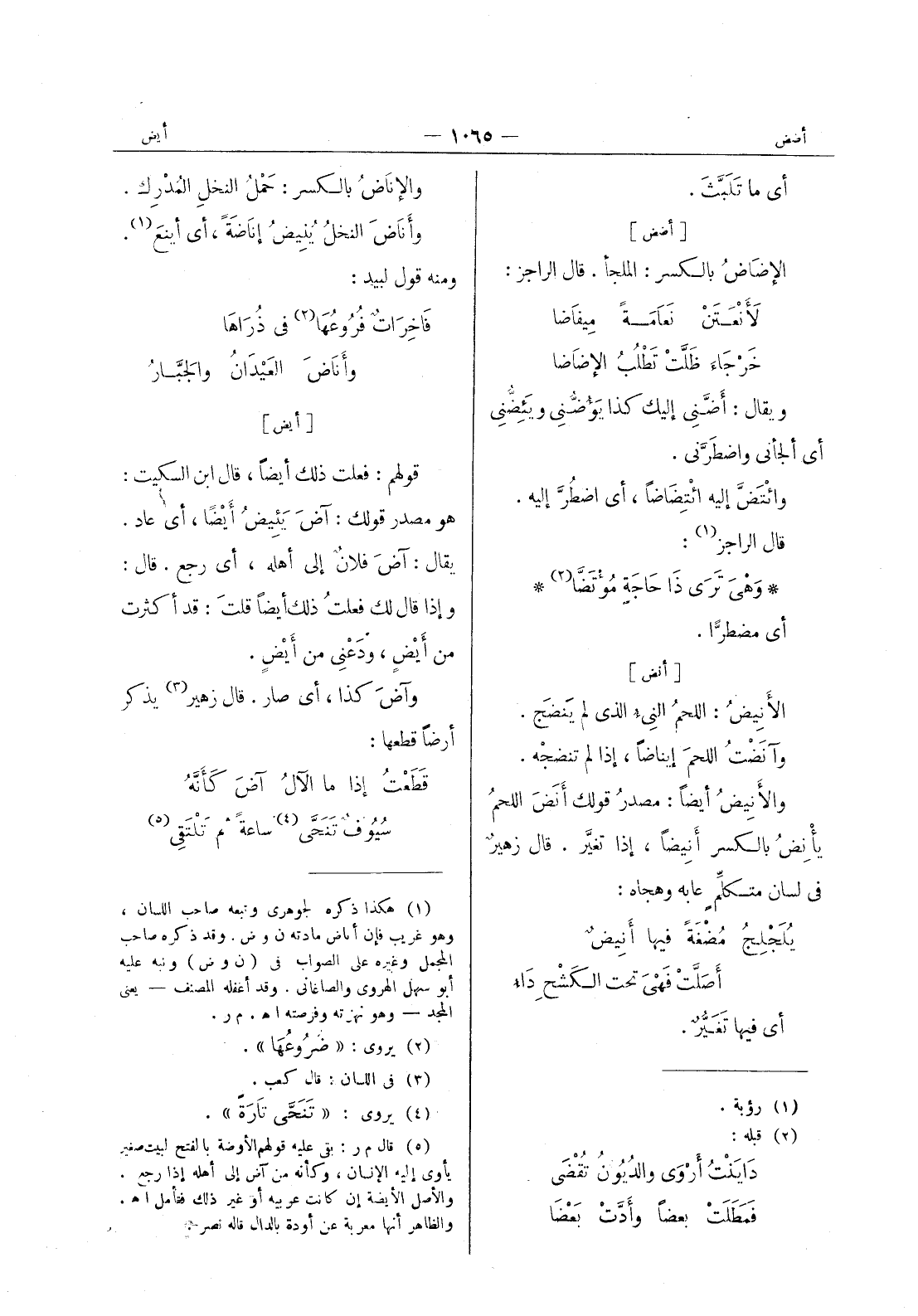 [أنض] الانيض: اللحم النئ الذى لم يَنضَج. وآنَضْتُ اللحمَ إيناضاً، إذا لم تنضجْه. والأنيض أيضاً: مصدرُ قولك أَنَضَ اللحمُ يأْنِضُ بالكسر أَنيضاً، إذا تغيَّر. قال زهيرٌ في لسان متكلِّمٍ عابه وهجاه: يُلَجْلِجُ مُضْغَةً فيها أنيضٌ * أَصَلَّتْ فَهْيَ تحت الكَشْحِ داءُ * أي فيها تغير.