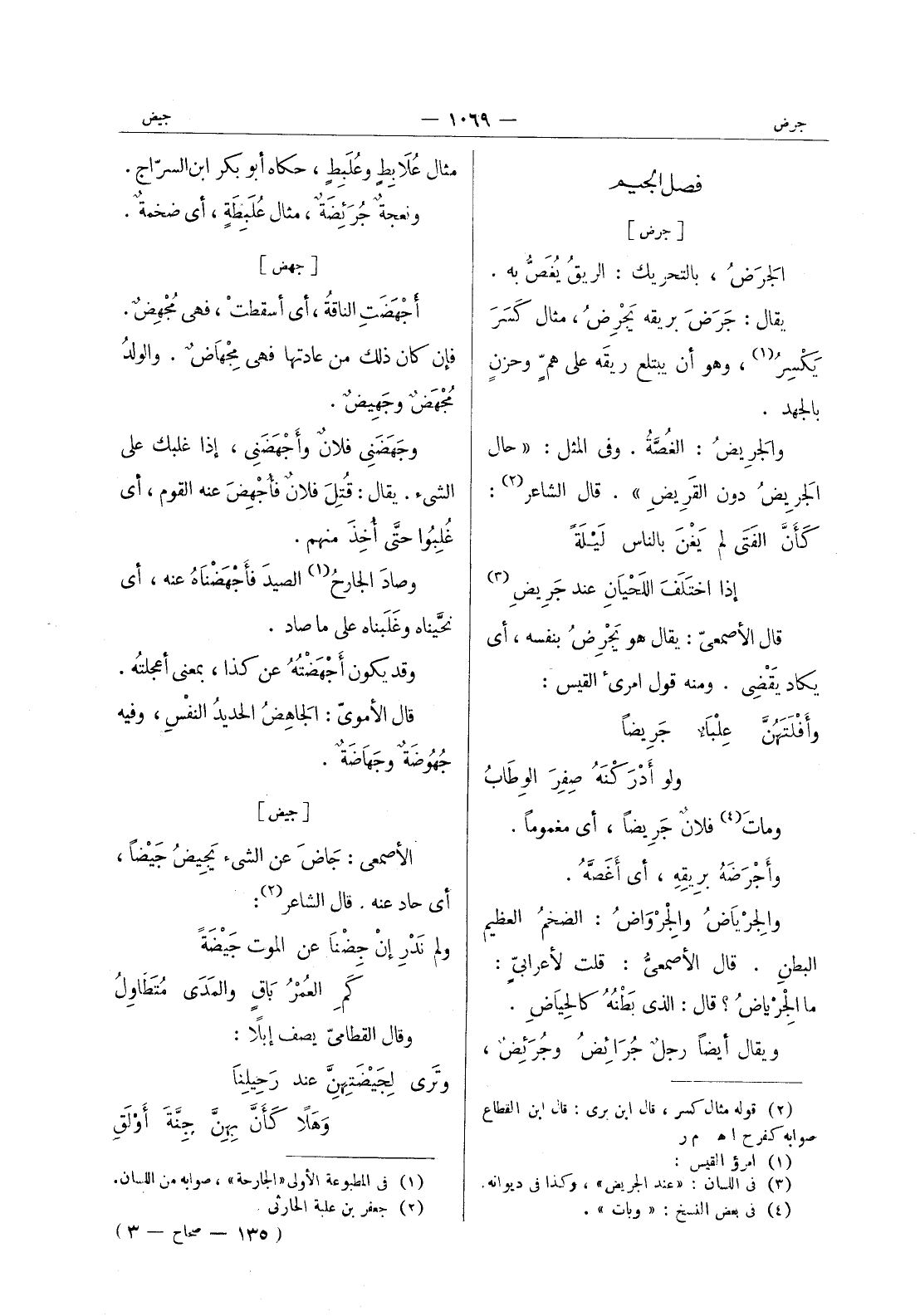 [جيض] الاصمعي: جاض عن الشئ يَجيضُ جَيْضاً، أي حاد عنه. قال الشاعر (¬2) : ولم نَدْرِ إنْ جِضْنا عن الموت جَيْضَةً * كَمِ العمر باق والمدى متطاول * وقال القطامى يصف إبلا: وترى لجيضتهن عند رحيلنا * وهلا كأن بهن جنة أولق *