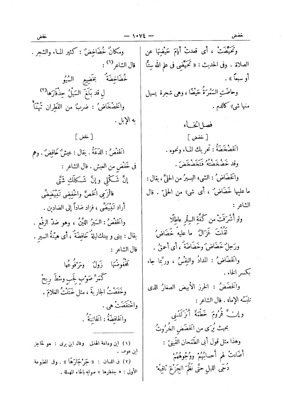 [خفض] الخَفْضُ: الدَعَةُ. يقال: عيشٌ خافِضٌ. وهم في خَفْضٍ من العيش. قال الشاعر: إن شكلي وإن شكلك شتى * فالزمى الخص واخفضى تبيضضى * أراد تبيضى، فزاد ضادا إلى الضادين. والخفض: السير اللين، وهو ضدّ الرفْع. يقال: بيني وبينك ليلةٌ خافِضَةٌ، أي هيّنةُ السيرِ. قال الشاعر: مخفوضها زول ومرفوعها * كَمَرِّ صَوْبٍ لَجِبٍ وَسْطَ ريحْ * وخَفَضْتُ الجاريةَ، مثل خَتَنْتُ الغلامَ. واختفضت هي. والخافضة: الخاتنة.