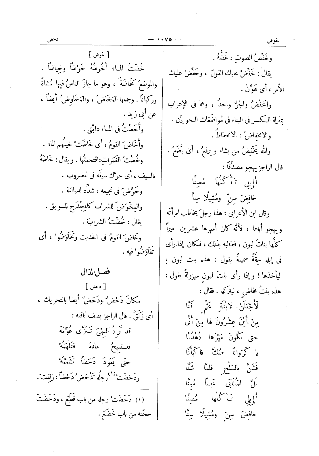 [خوض] خُضْتُ الماءَ أَخوضُهُ خَوْضاً وخِياضاً. والموضعُ مَخاضَةٌ، وهو ما جازَ الناسُ فيها مُشاةً وركباناً. وجمعها المخاض، والمخاوض أيضا، عن أبى زيد. وأخضت في الماء دابَّتي. وأَخاضَ القومُ، أي خاضَتْ خيلُهم الماءَ. وخُضْتُ الغَمَراتِ: اقتحمتُها. ويقال: خاضَهُ بالسيف، أي حرك سيفه في المضروب. وخَوَّضَ في نجيعه، شدِّد للمبالغة. والمخوض للشراب كالمجدح للسويق. يقال: خُضْتُ الشرابَ. وخاضَ القومُ في الحديث وتَخاوَضوا، أي تَفاوَضوا فيه.