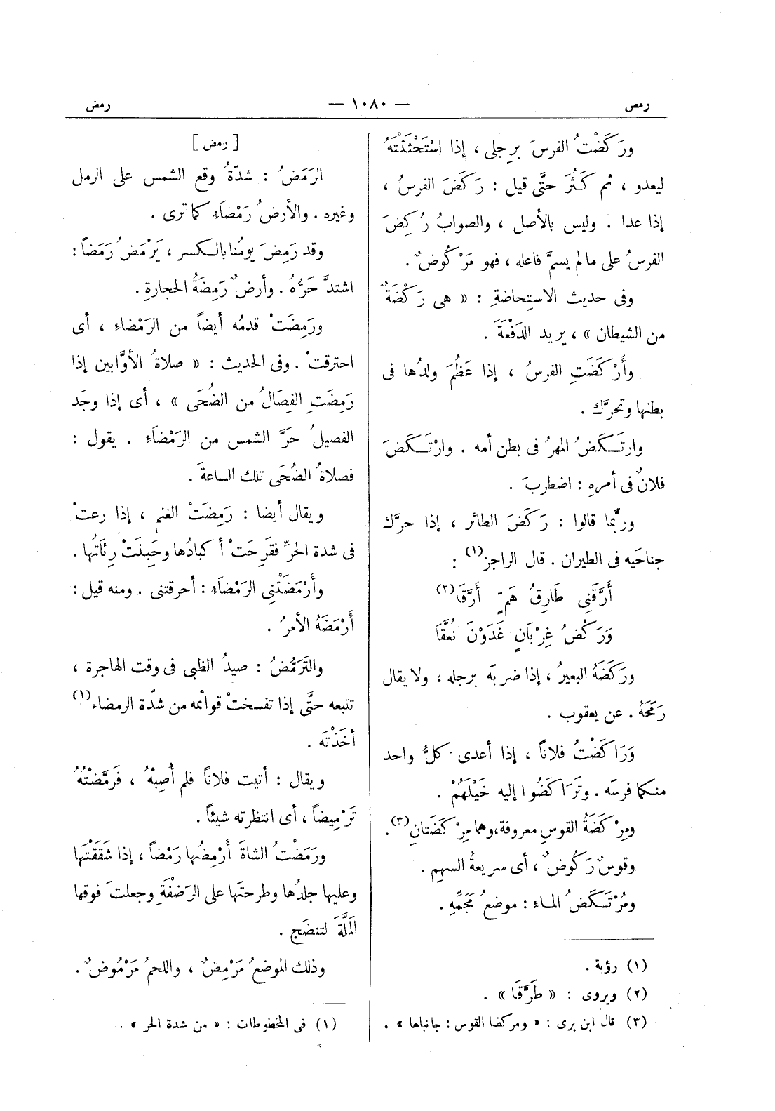 [رمض] الرَمَضُ: شدّةُ وقع الشمس على الرمل وغيره. والأرضُ رَمْضاء كما ترى. وقد رَمضَ يومُنا بالكسر، يَرْمَضُ رَمَضاً: اشتدَّ حَرُّهُ. وأرضٌ رَمِضَةُ الحجارةِ. ورَمِضَتْ قدمُه أيضاً من الرَمْضاءِ، أي احترقتْ. وفى الحديث: " صلاة الاوابين إذا رمضت الفصال من الضحى "، أي إذا وجد الفصيل حر الشمس من الرمضاء. يقول: فصلاة الضحى تلك الساعة. ويقال أيضاً: رَمِضَتْ الغنم، إذا رعتْ في شدة الحرِّ فقَرِحَتْ أكبادُها وحَبِنَتْ رِئاتُها. وأَرْمَضَتْني الرَمْضاءُ: أحرقتني. ومنه قيل: أَرْمَضَهُ الأمرُ. والتَرَمُّضُ: صيدُ الظبي في وقت الهاجِرة، تتبعه حتَّى إذا تفسختْ قوائمه من شدة الرمضاء (¬1) أخَذْتَه. ويقال: أتيت فلاناً فلم أصِبْهُ، فَرمَّضْتُهُ تَرْميضاً، أي انتظرته شيئاً. ورَمَضْتُ الشاةَ أَرْمِضُها رَمْضاً، إذا شَقَقْتَها وعليها جلدُها وطرحتَها على الرضفة وجعلت فوقها الملة لتنضج. وذلك الموضعُ مَرْمِضٌ، واللحم مَرْموضٌ.
