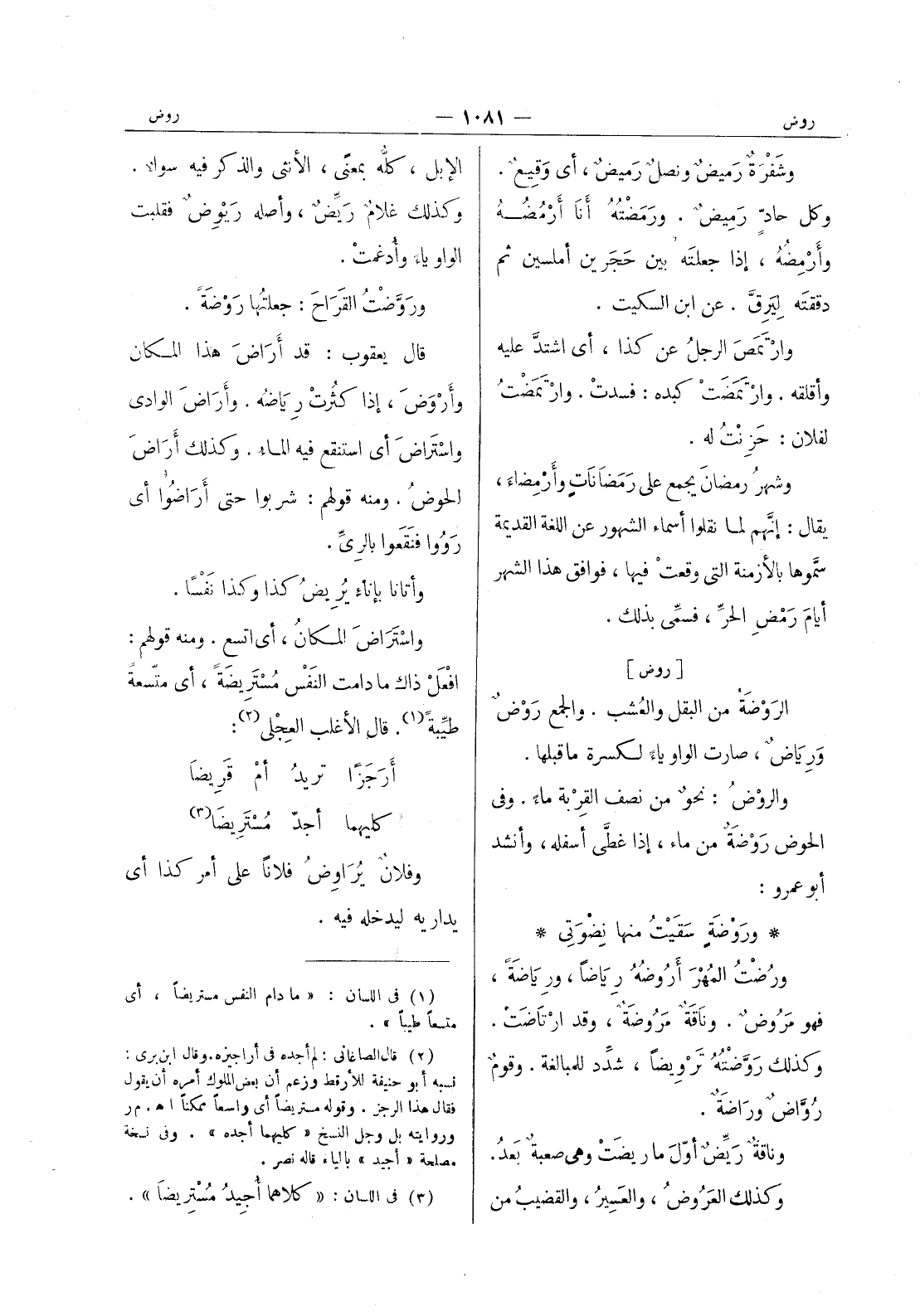الابل، كله بمعنى، الانثى والذكر فيه سواء. وكذلك غلامٌ رَيِّضٌ، وأصله رَيْوِضٌ فقلبت الواو ياءً وأُدْغمتْ. ورَوَّضْتُ القَراحَ: جعلتُها رَوْضَةً. قال يعقوب: قد أَراضَ هذا المكان وأَرْوَضَ، إذا كثُرَتْ رِياضُهُ. وأَراضَ الوادي واسْتَراضَ أي استنقع فيه الماءُ. وكذلك أَراضَ الحوضُ. ومنه قولهم: شربوا حتى أراضُوا أي رَوُوا فَنَقَعوا بالرِيِّ. وأتانا بإِناءٍ يُرِيضُ كذا وكذا نَفساً. واسْتَراضَ المكانُ، أي اتسع. ومنه قولهم: افًعَلْ ذاك ما دامت النَفْس مُسْتَرِيضَةً، أي متسعة طيبة (¬1) . قال الاغلب العجلى (¬2) : أرجزا تريد أم قريضا * كليهما أجد مستريضا (¬3) * وفلان يراوض فلانا على أمر كذا أي يداريه ليدخله فيه.