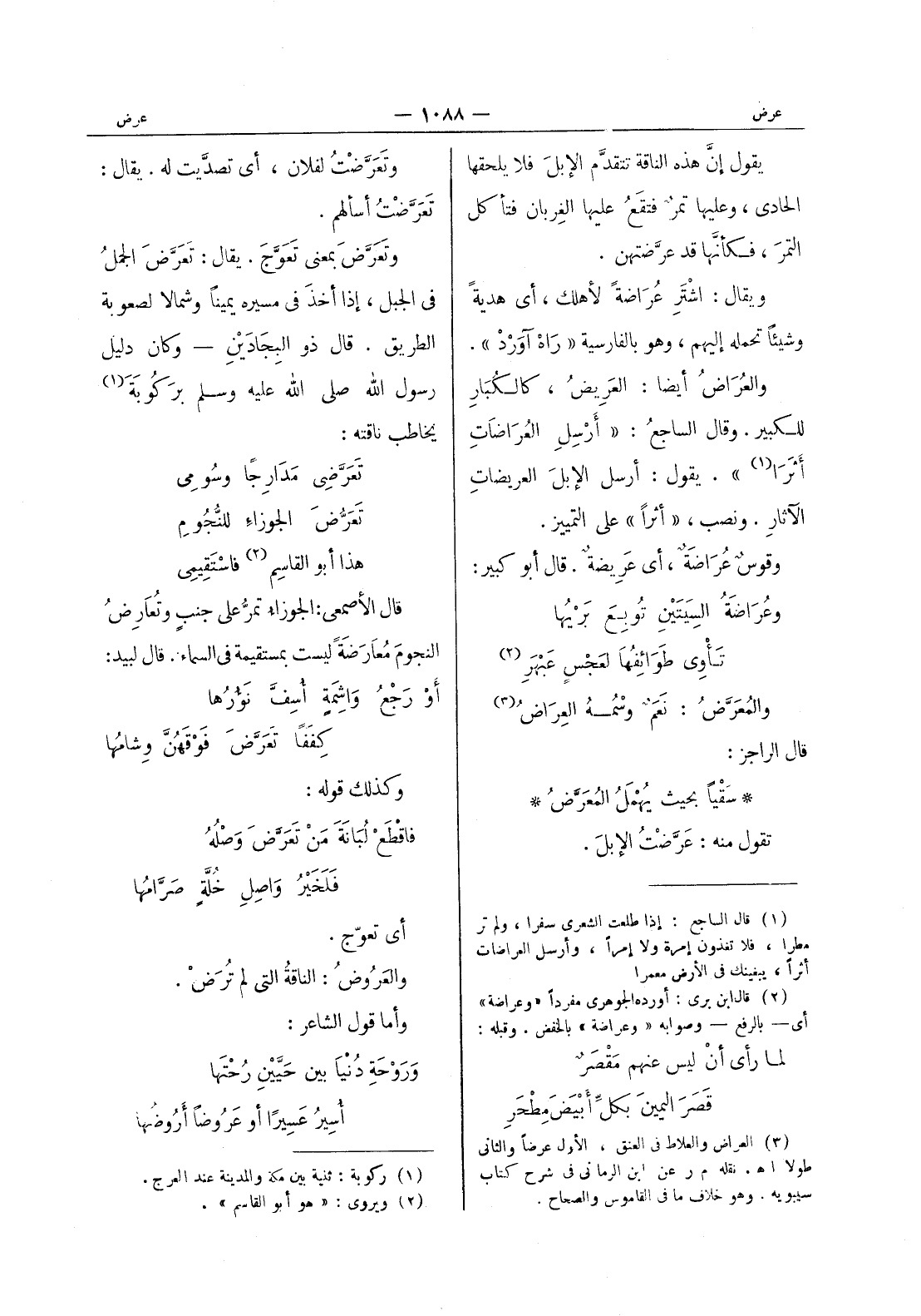 وتعرضت لفلان، أي تصدَّيت له. يقال: تعرَّضتُ أسألهم. وتعرَّض بمعنى تعوَّجَ. يقال: تعرَّض الجملُ في الجبل، إذا أخذَ في مسيره يميناً وشمالاً لصعوبة الطريق. قال ذو البِجادَيْنِ - وكان دليل رسول الله صلّى الله عليه وسلم برَكوبَةَ (¬1) يخاطب ناقته: تَعَرَّضي مَدارِجا وسومي * تَعَرُّضَ الجوزاءِ للنُّجومِ * هذا أبو القاسِم (¬2) فاسْتَقيمي * قال الأصمعي: الجوزاء تمرُّ على جنبٍ وتُعارِضُ النجوم مُعَارَضةً ليست بمستقيمة في السماء. قال لبيد: أو رجع واشمة أسف نؤرها * كففا تعرض فوقهن وشامها * وكذلك قوله: فاقْطَعْ لُبَانَةَ مَنْ تَعَرَّضَ وَصْلُهُ * فَلَخَيْرُ واصِلِ خُلَّةٍ صَرَّامُها * أي تعوَّج. والعَروضُ: الناقة التي لم ترض. وأما قول الشاعر: وروحة دنيا بين حيين رحتها * أسير عسيرا أو عروضا أروضها *